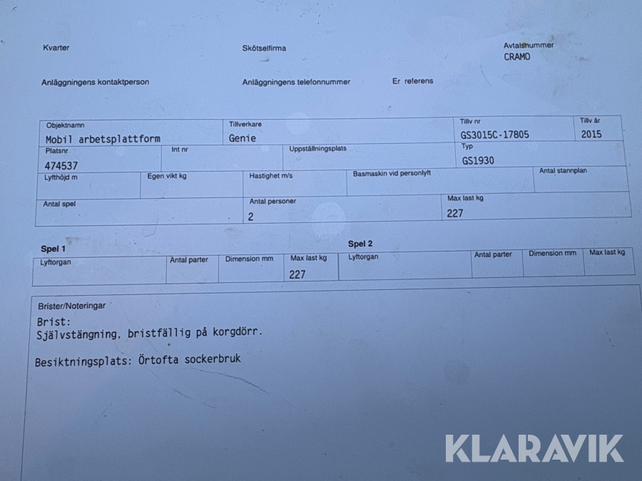 Du som köpare är skyldig att kontrollera objektet vid hämtning. Skiljer sig något avsevärt jämfört med informationen på klaravik.se? Kontakta då Klaravik innan du tar objektet från platsen. Läs fullständiga köpvillkor.