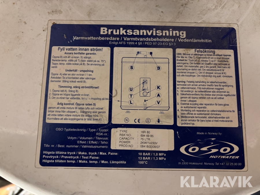 Boka frakt? Det finns ingen specifik information om frakt för just det här objektet, men om du skickar oss en förfrågan via vårt fraktformulär, så undersöker vi möjligheten. Paket, EU-pall eller större maskin? Klaravik har fraktavtal med Schenker och i de fall vi kan hjälpa till med frakt gäller det objekt som ryms i paket eller inom en EU-pall (upp till 120*80 cm och 990 kg). Det går att beställa frakt inom Sverige, dock inte till utlandet. Vid frakt på större maskiner rekommenderar vi gärna transportföretag som du kan kontakta.