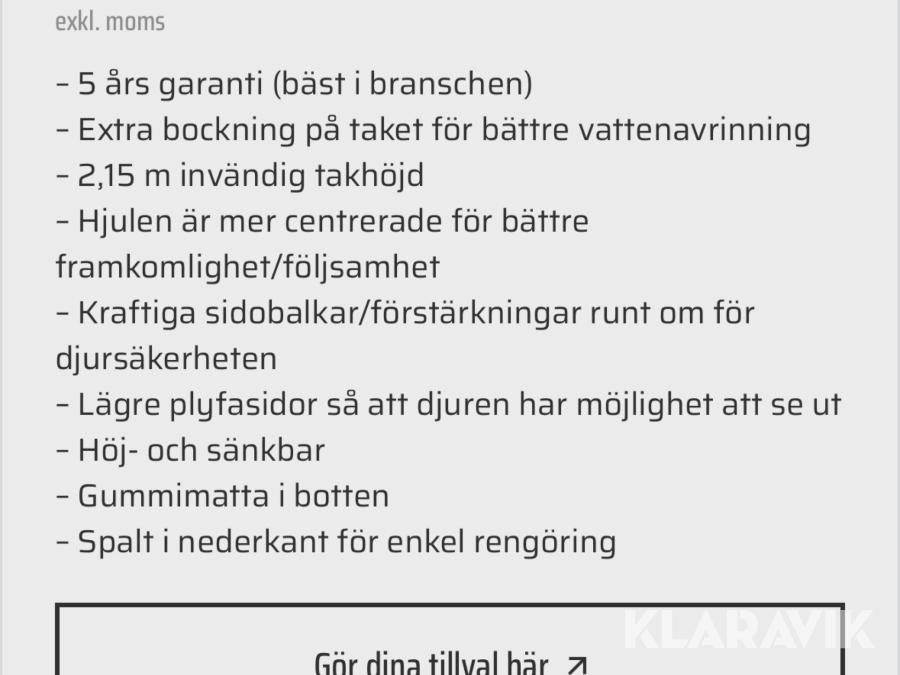 Du som köpare är skyldig att kontrollera objektet vid hämtning. Skiljer sig något avsevärt jämfört med informationen på klaravik.se? Kontakta då Klaravik innan du tar objektet från platsen. Läs fullständiga köpvillkor.