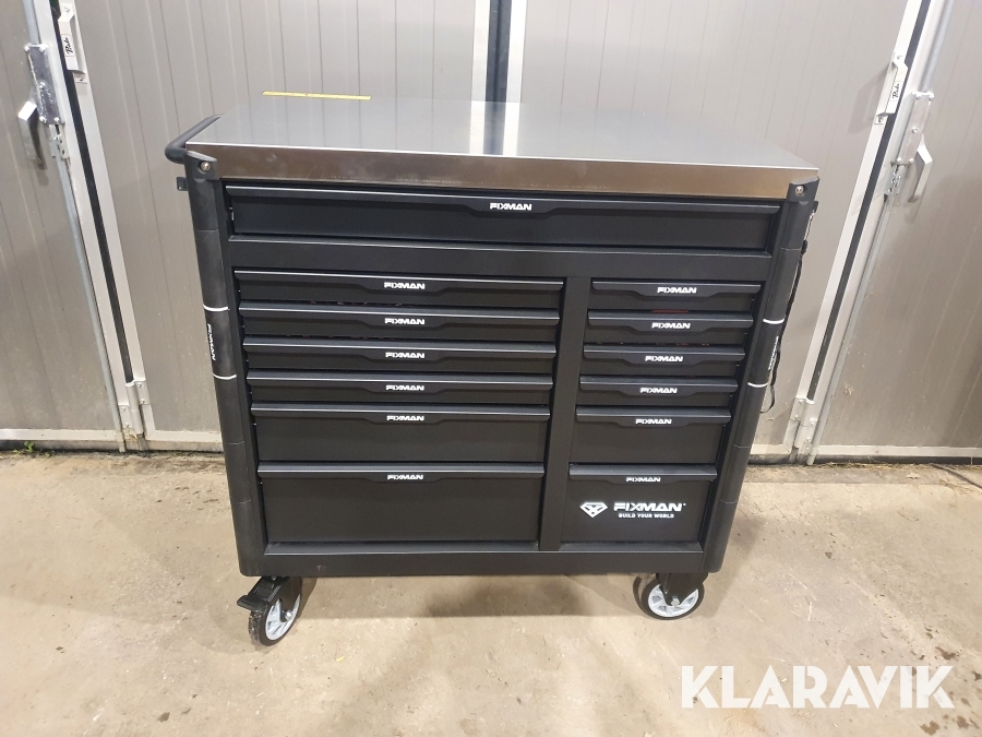 Vagn för verktyg tillverkad i stål med 13 lådor varav de 11 översta lådorna är fyllda med 467 st verktyg.