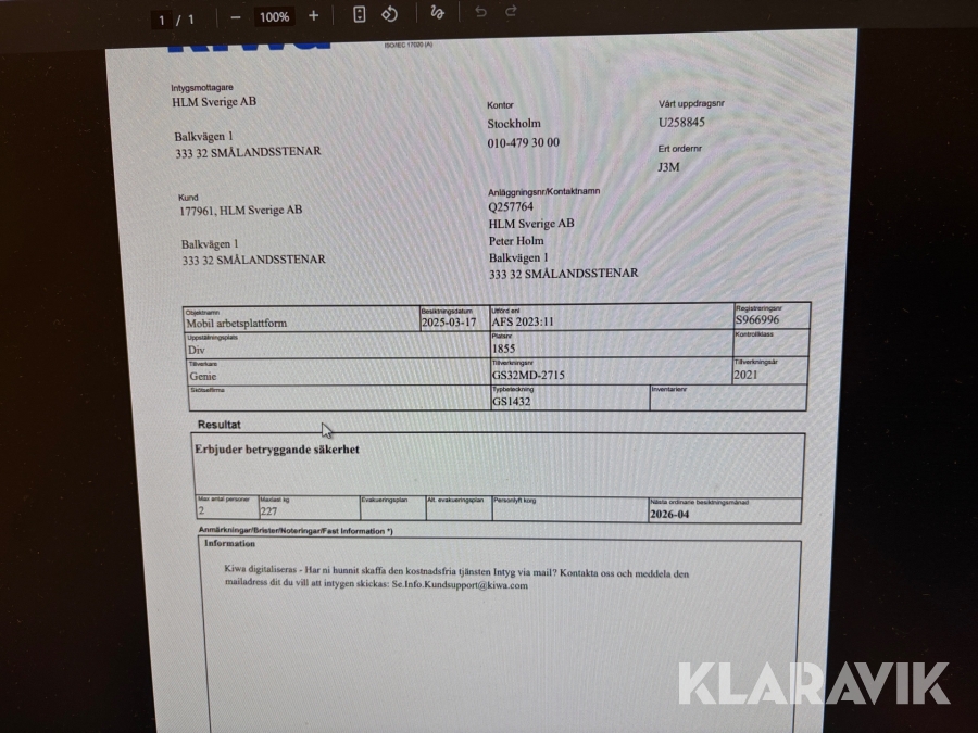 Du som köpare är skyldig att kontrollera objektet vid hämtning. Skiljer sig något avsevärt jämfört med informationen på klaravik.se? Kontakta då Klaravik innan du tar objektet från platsen. Läs fullständiga köpvillkor.