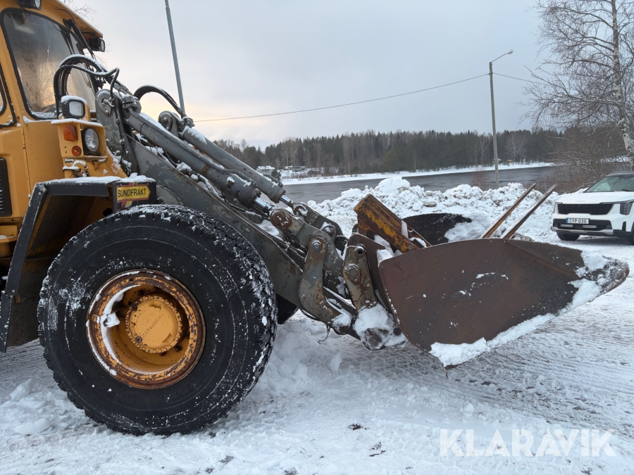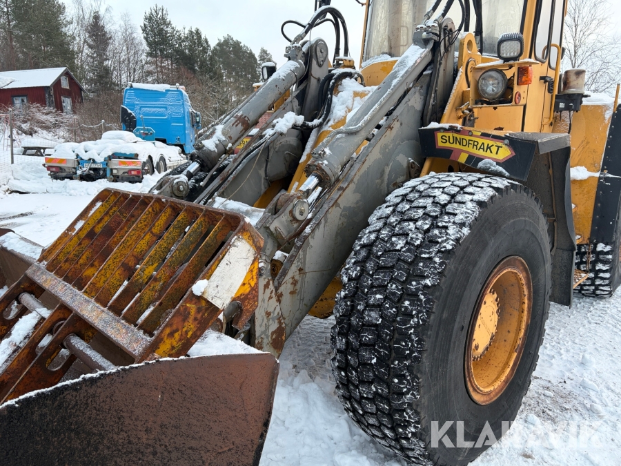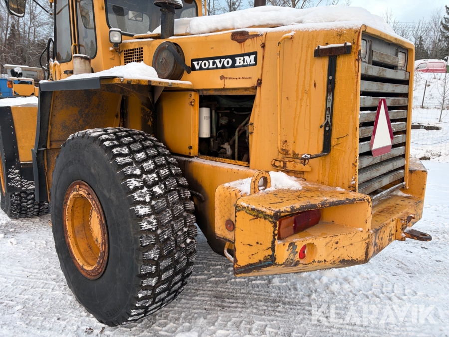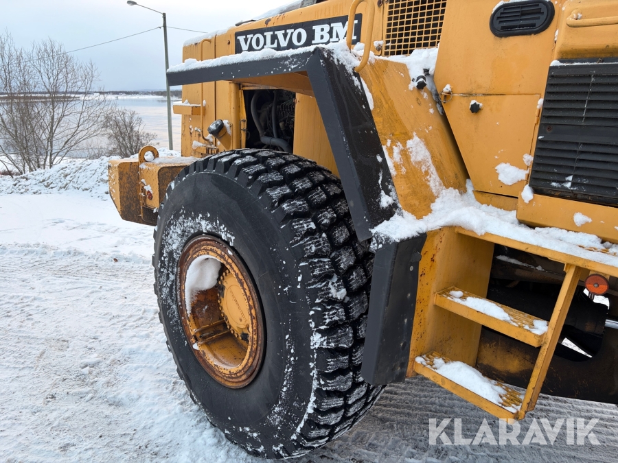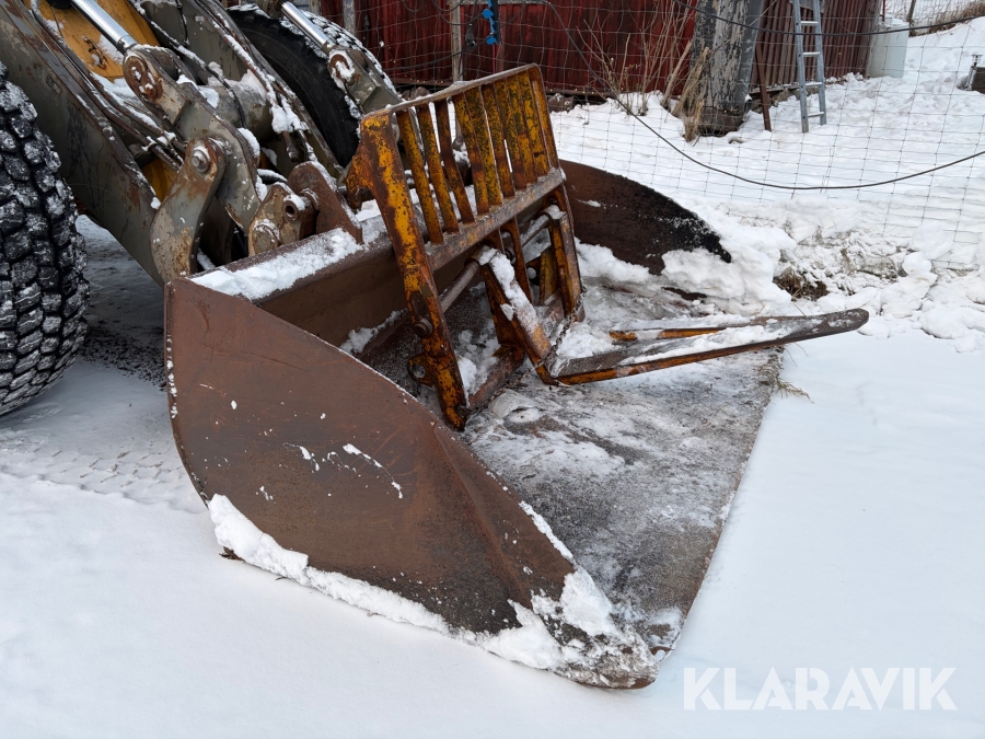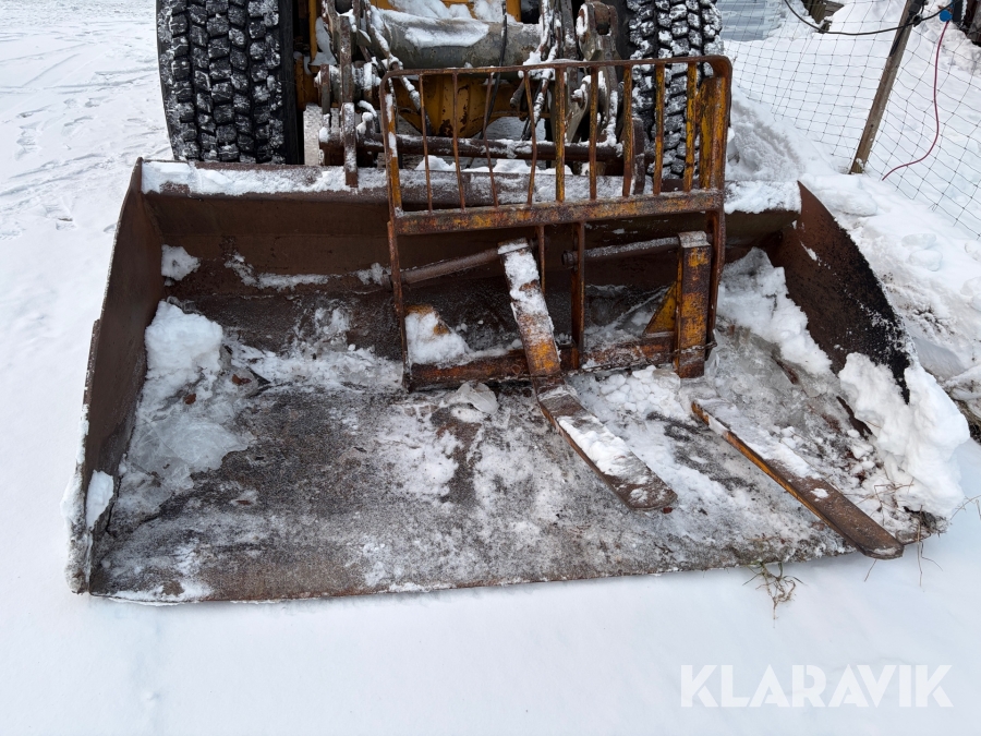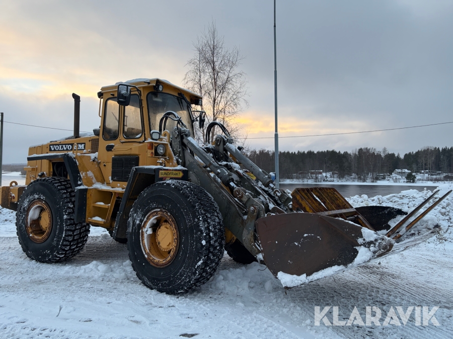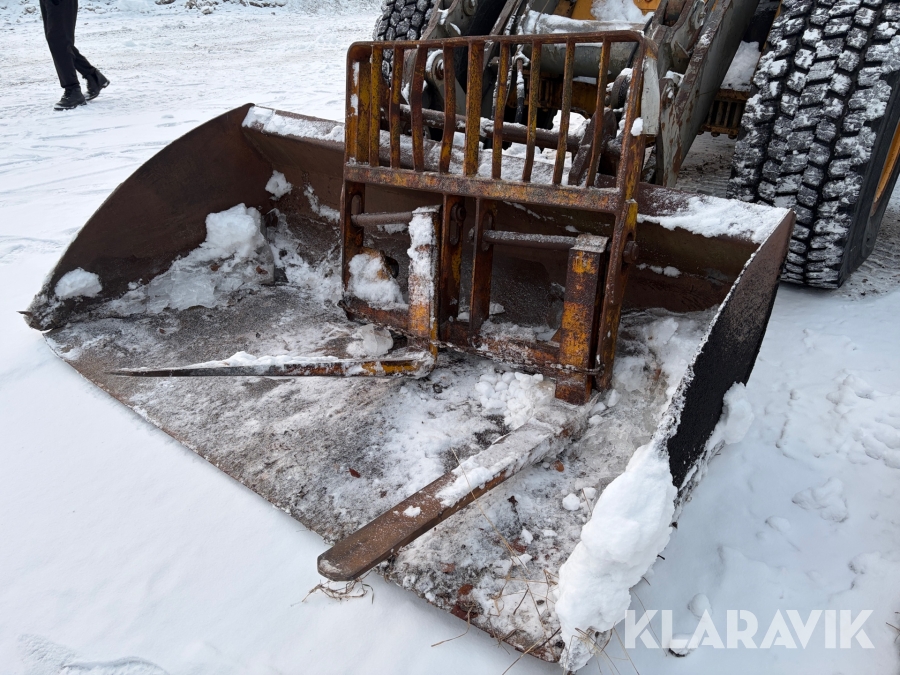 Hjullastare Volvo BM L90 med planeringsskopa och pallgafflar