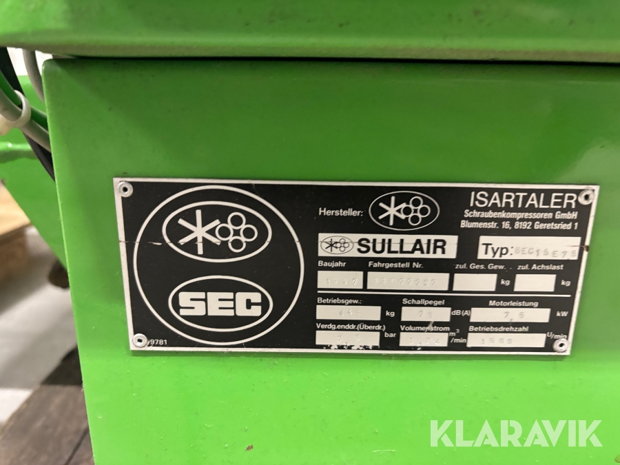 Skruvkompressor Sullair SEC 15 E10 7.5kW 7,5bar Plejdstyrd