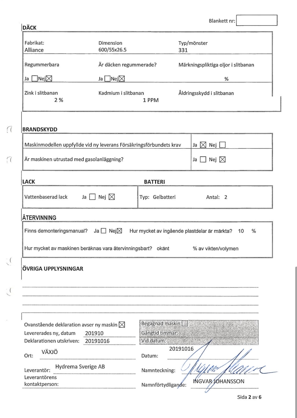 • Serie/chassinummer framgår