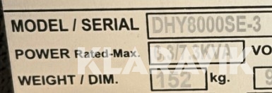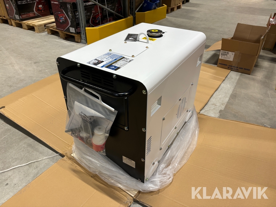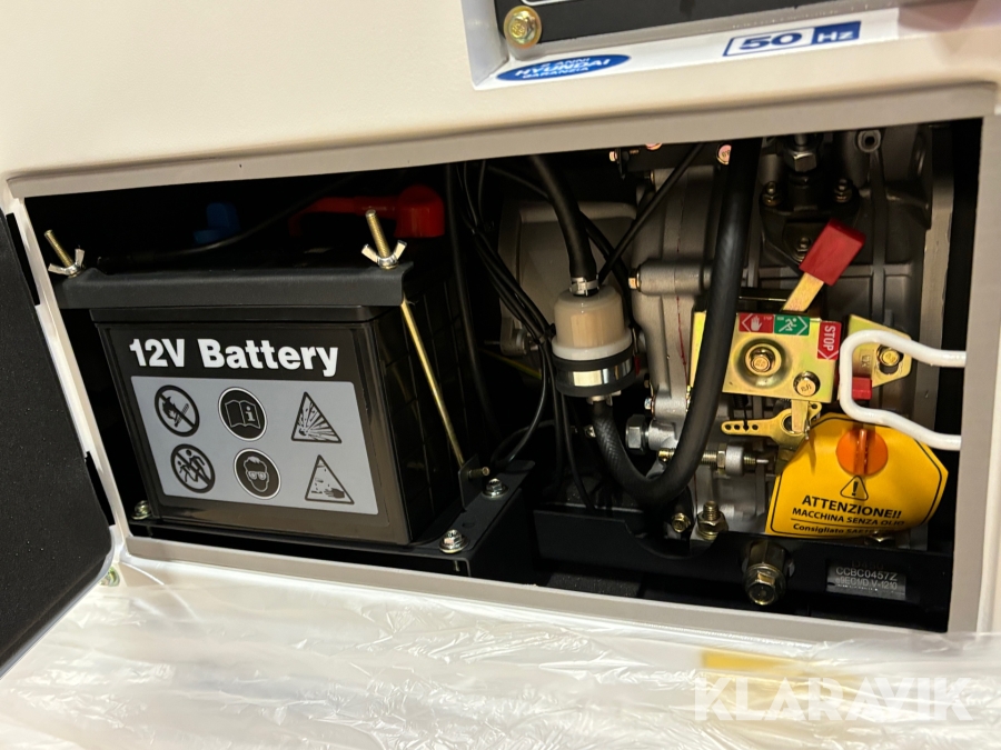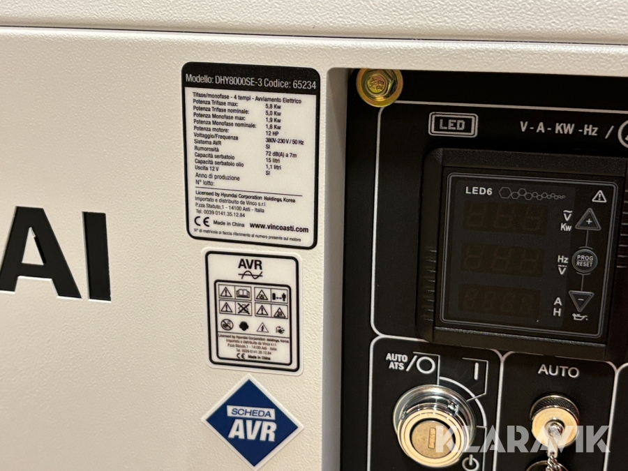 Ny Hyundai dieselgenerator D500E, 12 hk, nominell effekt 6,3kVA, Max 7,3kVA. Trefas ljuddämpad dieselelektrisk generator. Den utvecklar en maximal utgångseffekt på 5,8 kW. Konstant driftseffekt 5,0 kW. Elektrisk start. Utrustad med AVR-kort.