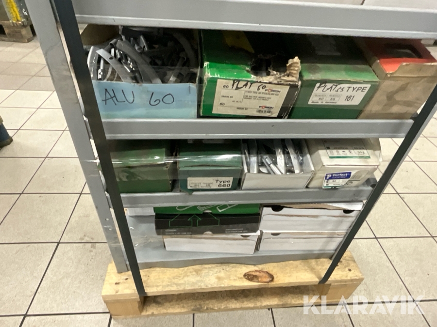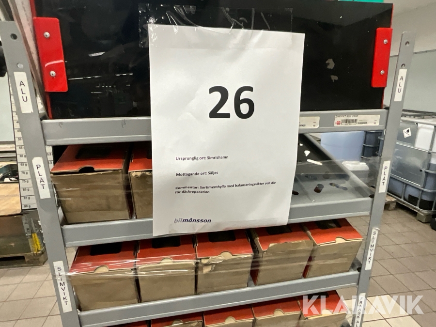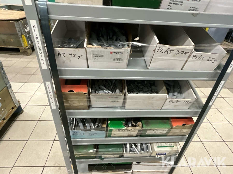 Sortimenthylla med balanseringsvikter och diverse för däckreperation