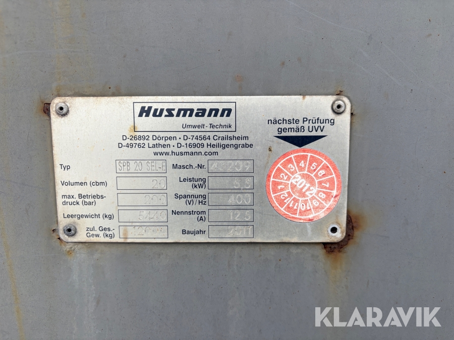 Komprimator 20 kubik Husmann SPB 20 SEL-E på lastväxlarram