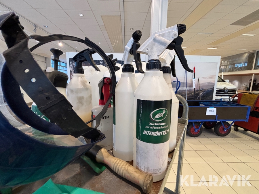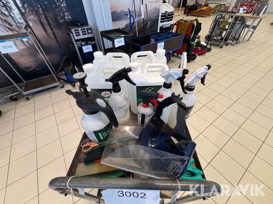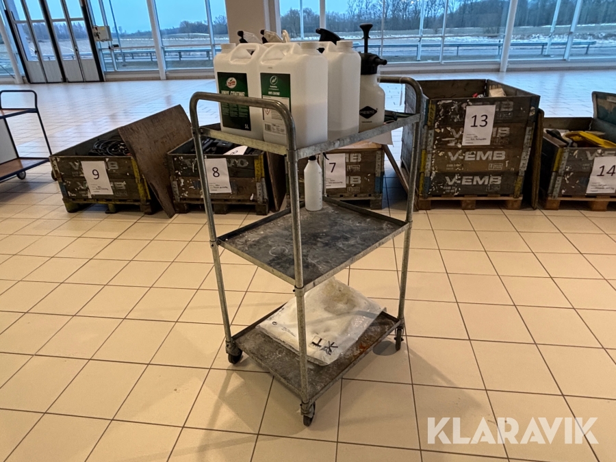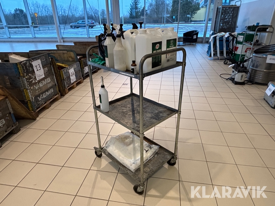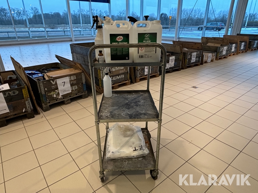 Verkstadsvagn med diverse bilvårdsprodukter