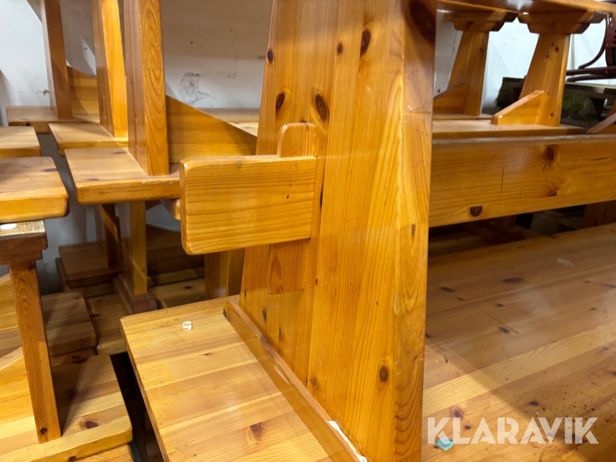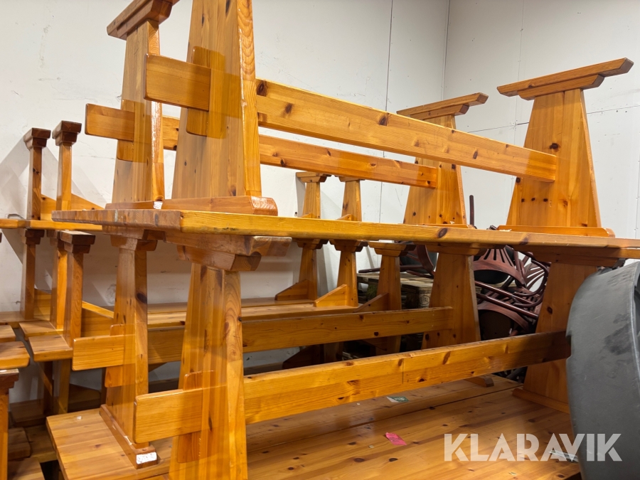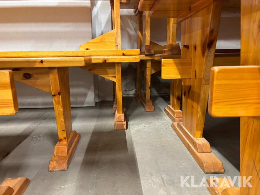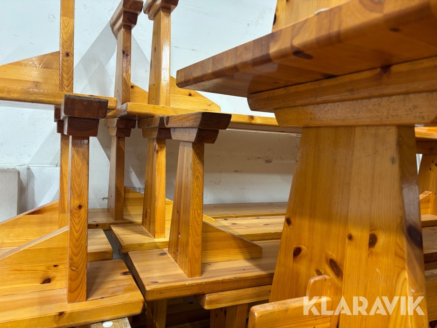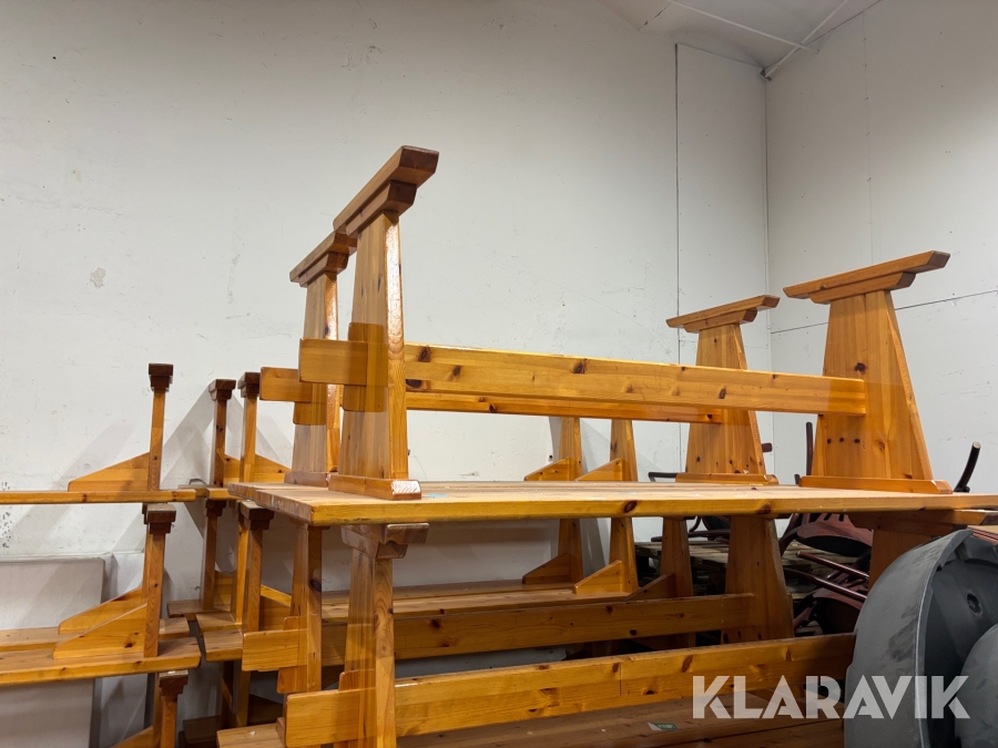 Träbord med bänkar 12 bänkar och 7 bord