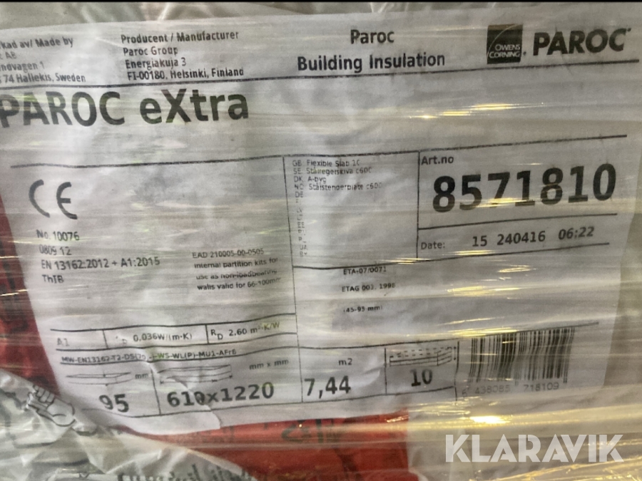 Parti med stålregelskivor/isolering Paroc 95x610x1220 mm