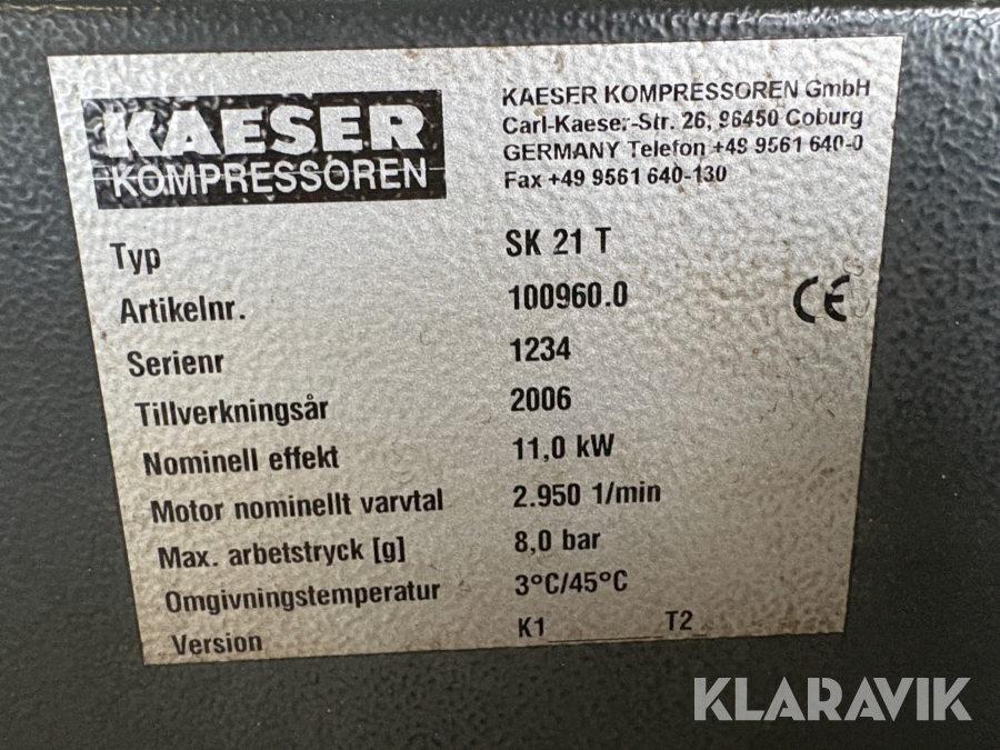 Kompressor Kaeser SK 21 T med tryckluftbehållare