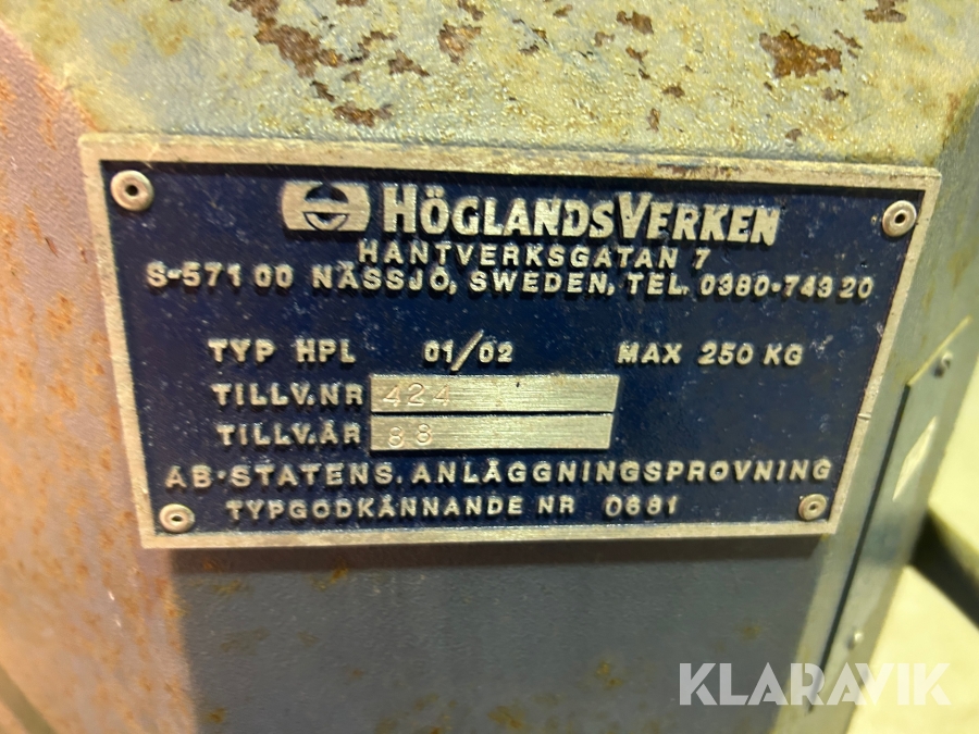 Boka frakt? Det finns ingen specifik information om frakt för just det här objektet, men om du skickar oss en förfrågan via vårt fraktformulär, så undersöker vi möjligheten. Paket, EU-pall eller större maskin? Klaravik har fraktavtal med Schenker och i de fall vi kan hjälpa till med frakt gäller det objekt som ryms i paket eller inom en EU-pall (upp till 120*80 cm och 990 kg). Det går att beställa frakt inom Sverige, dock inte till utlandet. Vid frakt på större maskiner rekommenderar vi gärna transportföretag som du kan kontakta.