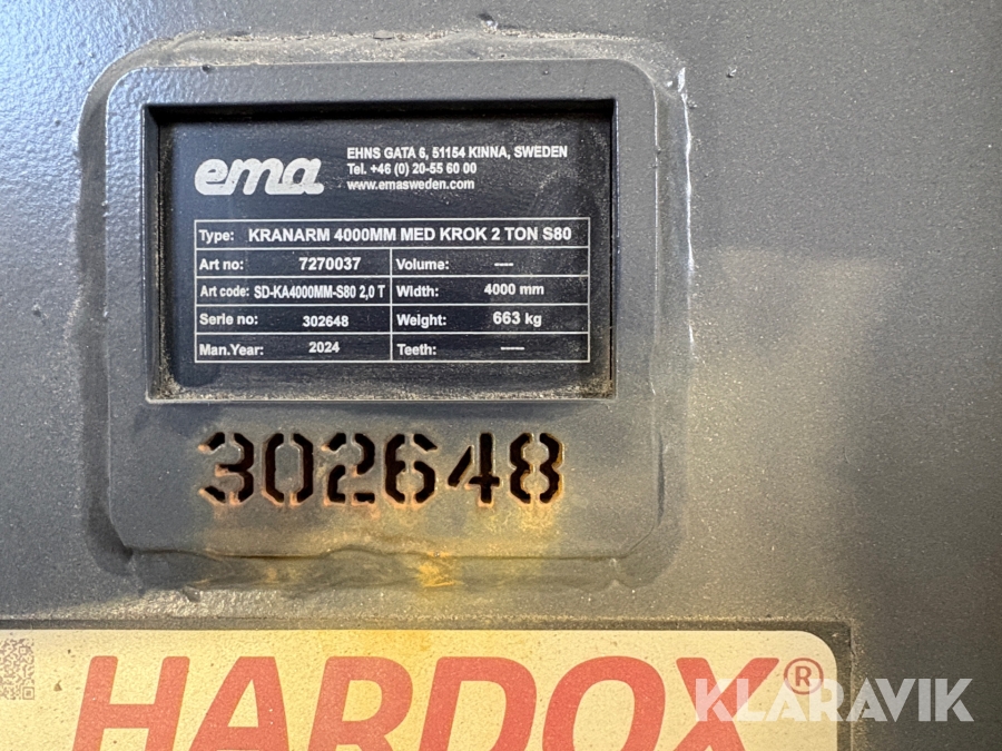Kranarm 4000mm med krok Ema S80