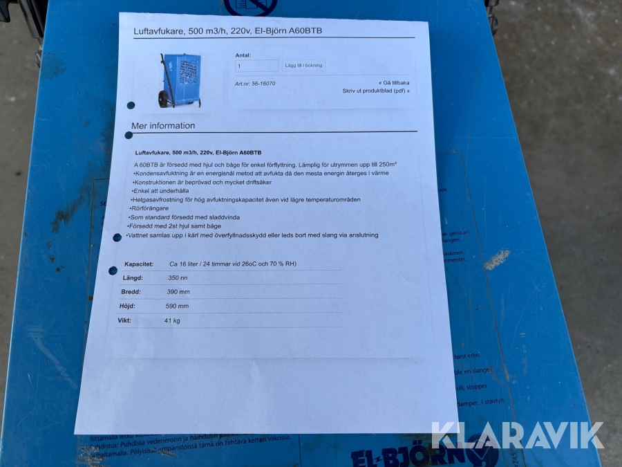 Avfuktare El-Björn A60BTB med hjul och båge