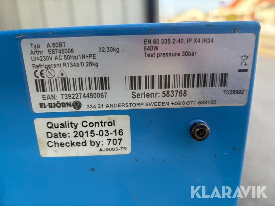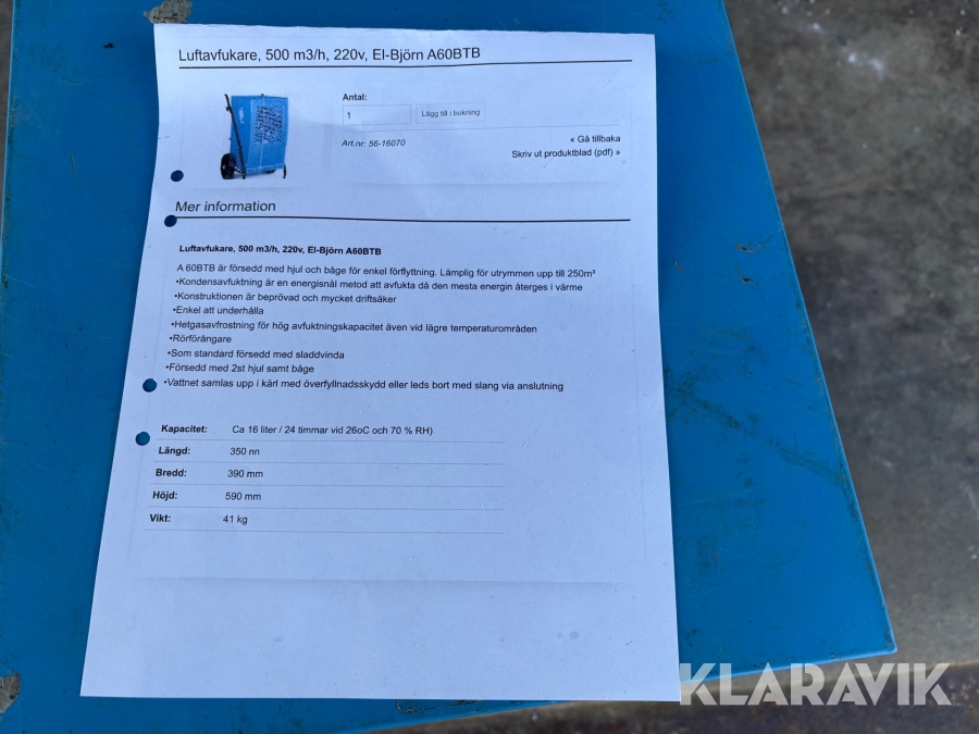 Boka frakt? Det finns ingen specifik information om frakt för just det här objektet, men om du skickar oss en förfrågan via vårt fraktformulär, så undersöker vi möjligheten. Paket, EU-pall eller större maskin? Klaravik har fraktavtal med Schenker och i de fall vi kan hjälpa till med frakt gäller det objekt som ryms i paket eller inom en EU-pall (upp till 120*80 cm och 990 kg). Det går att beställa frakt inom Sverige, dock inte till utlandet. Vid frakt på större maskiner rekommenderar vi gärna transportföretag som du kan kontakta.