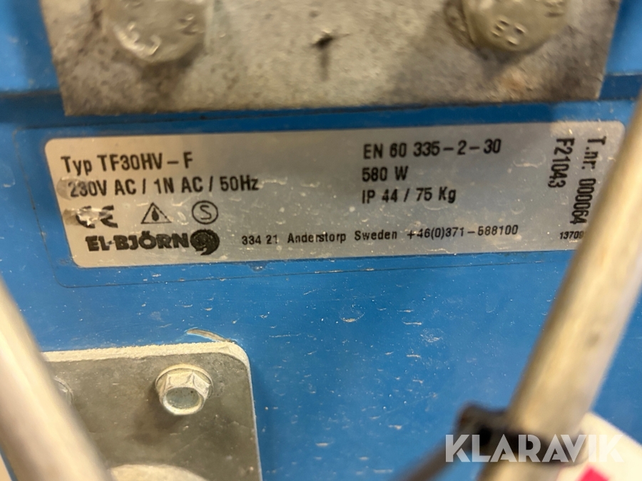 Boka frakt? Det finns ingen specifik information om frakt för just det här objektet, men om du skickar oss en förfrågan via vårt fraktformulär, så undersöker vi möjligheten. Paket, EU-pall eller större maskin? Klaravik har fraktavtal med Schenker och i de fall vi kan hjälpa till med frakt gäller det objekt som ryms i paket eller inom en EU-pall (upp till 120*80 cm och 990 kg). Det går att beställa frakt inom Sverige, dock inte till utlandet. Vid frakt på större maskiner rekommenderar vi gärna transportföretag som du kan kontakta.