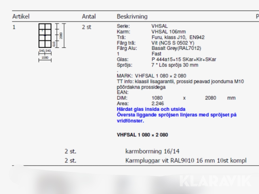 Du som köpare är skyldig att kontrollera objektet vid hämtning. Skiljer sig något avsevärt jämfört med informationen på klaravik.se? Kontakta då Klaravik innan du tar objektet från platsen. Läs fullständiga köpvillkor.