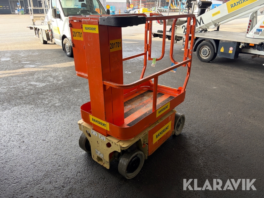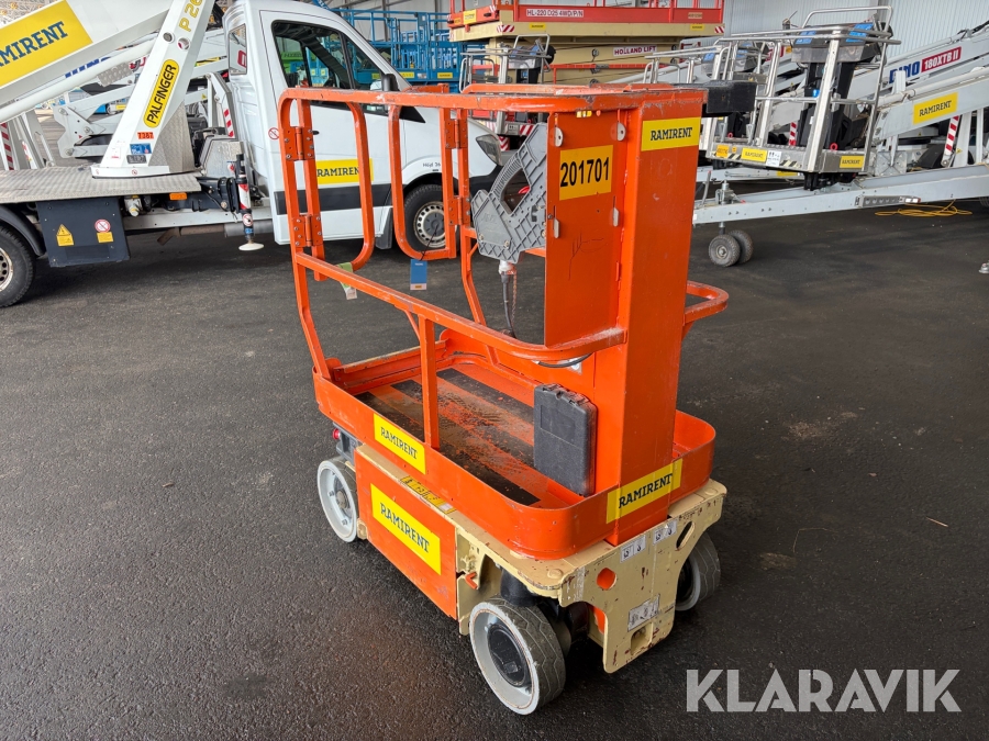 Hydrauldriven pelarlift med tyst och mjuk drift. Denna modell har solida avtrycksfria däck och passar för miljöer med plant och hårt underlag. Genom sin kompakta design är den lättmanövrerad i trånga utrymmen som t.ex. gallerior, kontor och varuhus. Körbar vid full höjd. Servicevänlig och bara 4st hydraulslangar minimerar läckagerisken. Når full höjd på 12 sek.