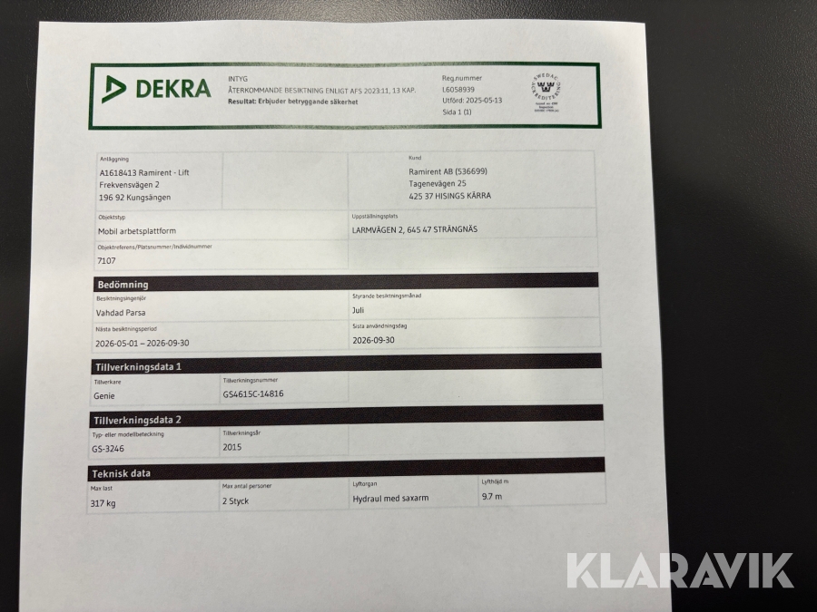 Du som köpare är skyldig att kontrollera objektet vid hämtning. Skiljer sig något avsevärt jämfört med informationen på klaravik.se? Kontakta då Klaravik innan du tar objektet från platsen. Läs fullständiga köpvillkor.
