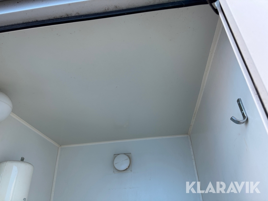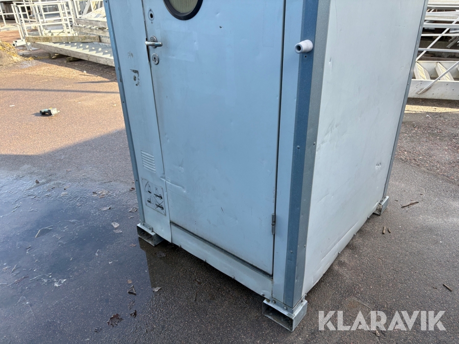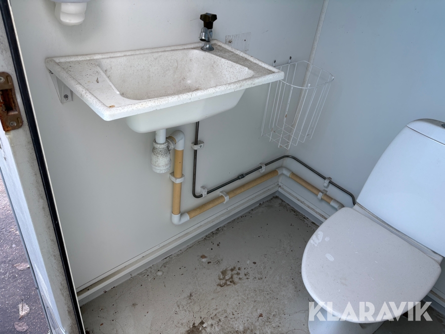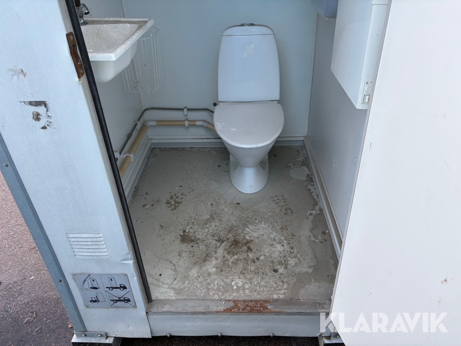 Vattenspolad toalett med anslutning till vatten och avlopp. Inredd med Toalettstol, handfat och element.