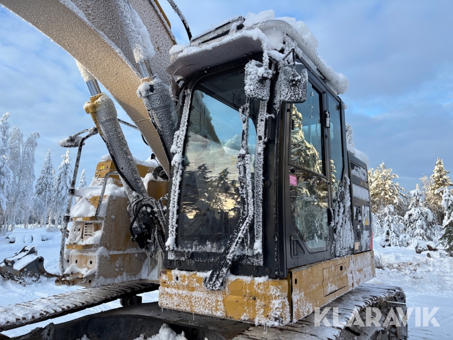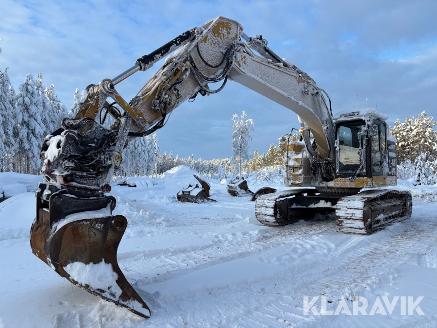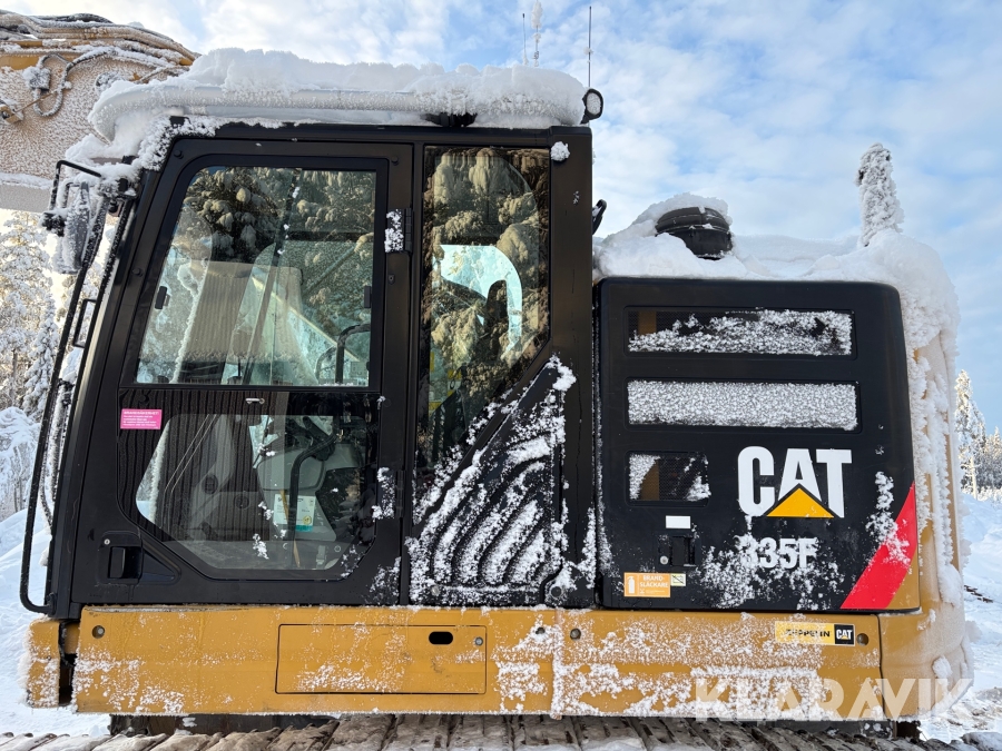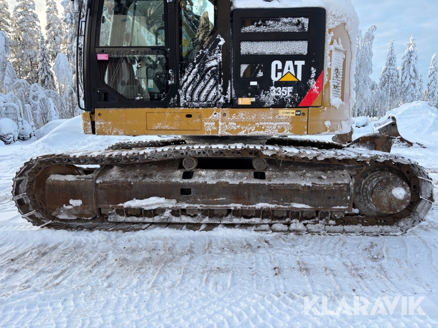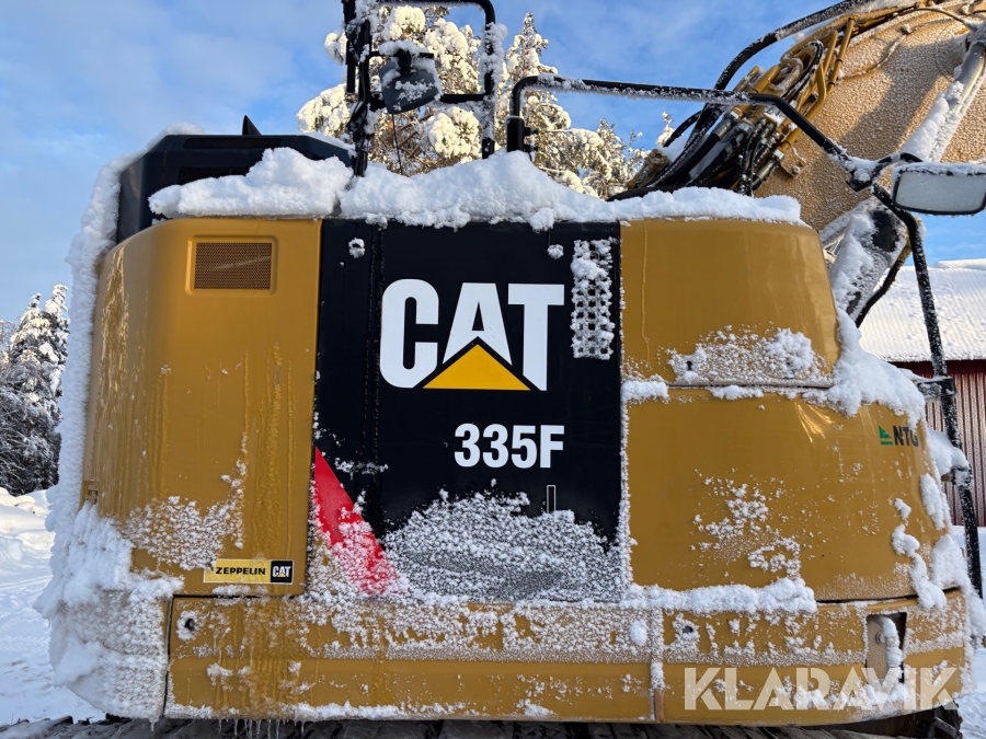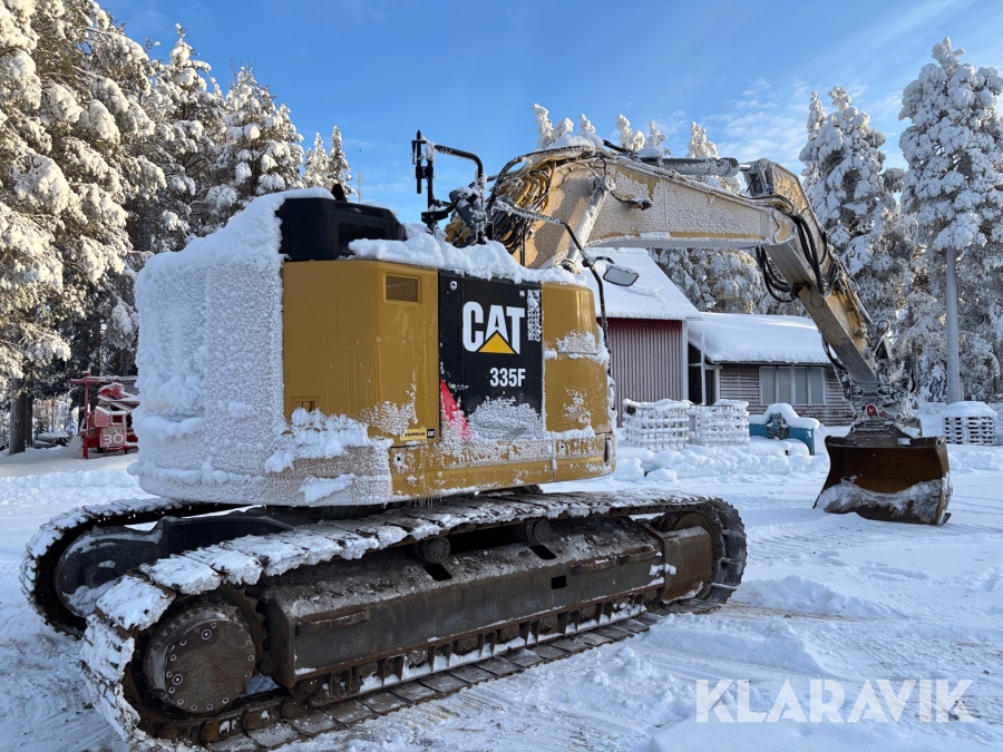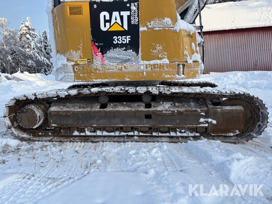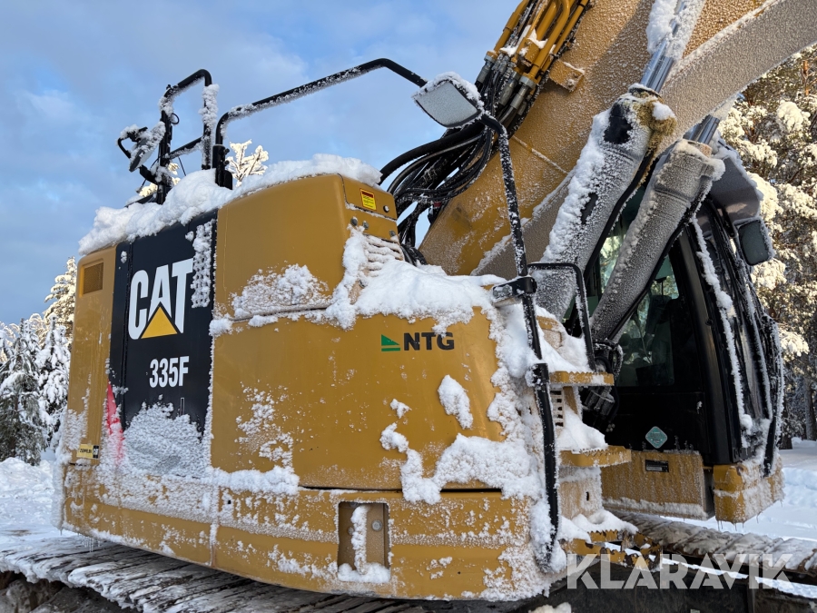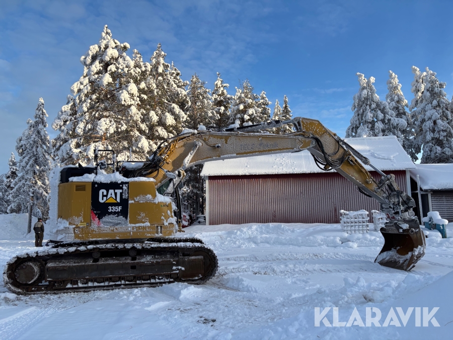 Grävmaskin CAT 335F med flera redskap.