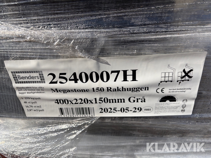 Mursten Benders Megastone 150 Rakhuggen grå 400 x 220 x 150 mm ca 4 pall ca 11 m2 x 150 mm ca 4 pall/11 m2