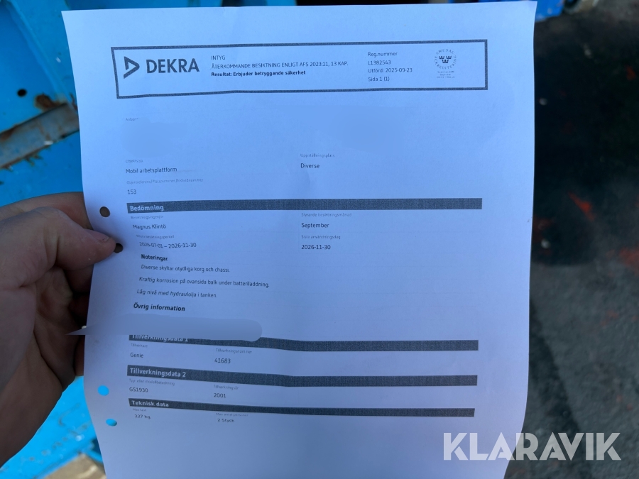 Du som köpare är skyldig att kontrollera objektet vid hämtning. Skiljer sig något avsevärt jämfört med informationen på klaravik.se? Kontakta då Klaravik innan du tar objektet från platsen. Läs fullständiga köpvillkor.