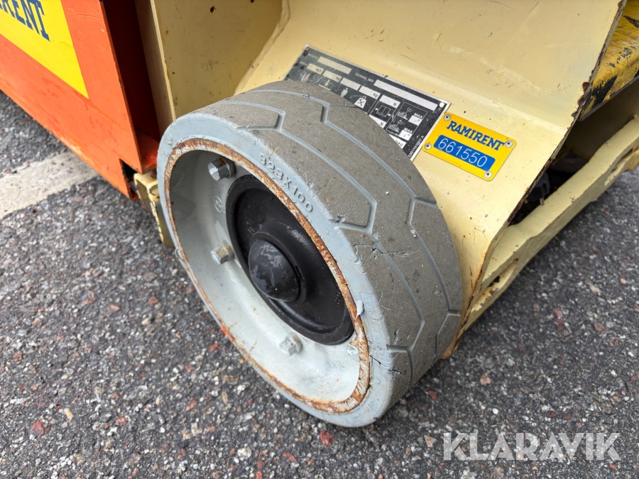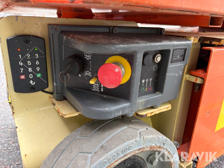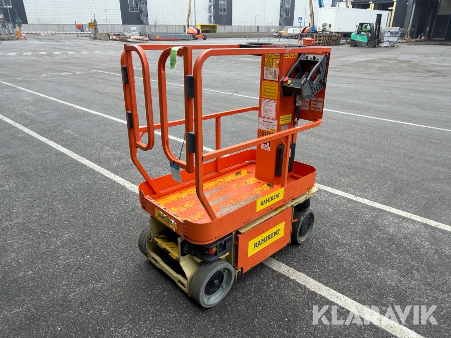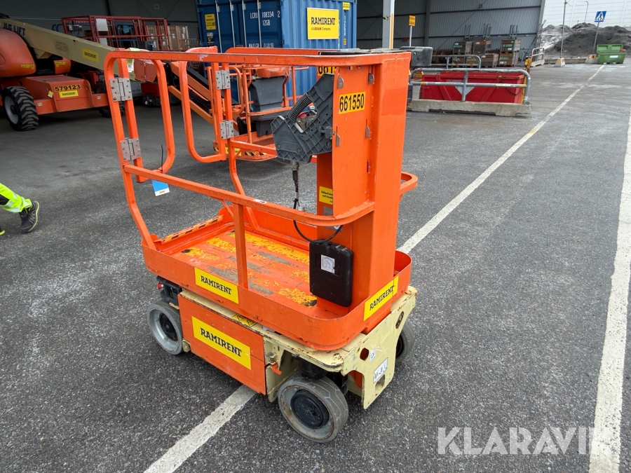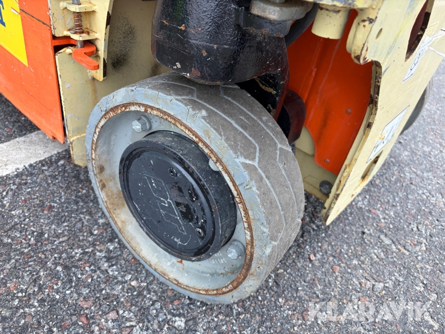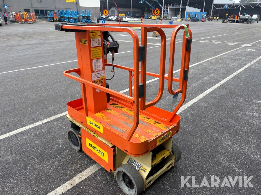 JLG 1230ES är en kompakt och eldriven pelarlift som är idealisk för arbete på höjd i trånga inomhusmiljöer. Med en arbetshöjd på upp till 5,66 meter och en plattformskapacitet på 230 kg erbjuder den en stabil och säker arbetsplattform för en person med verktyg. Dess smala bredd på endast 0,76 meter och låga vikt på cirka 790 kg gör den lätt att manövrera genom standarddörrar och i hissar, vilket underlättar arbete i begränsade utrymmen. Med en svängradie på endast 13 cm och en körhastighet på upp till 4,8 km/h i nedfällt läge är den mycket lättmanövrerad. Säkerhetsfunktioner som lutningssensor, potthålsskydd och varningslarm är standard, vilket gör JLG 1230ES till ett pålitligt val för underhålls- och installationsarbeten inomhus.