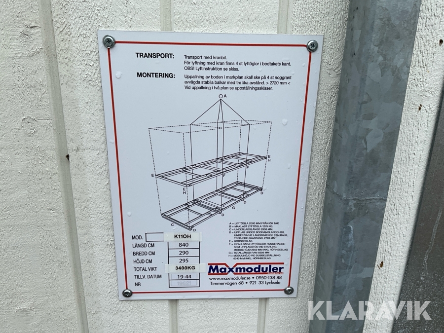 For sheds and containers (10 feet and larger), loading assistance can be purchased. Payment is made either by invoice or by card at the seller's location. The cost per lift is SEK 500 + VAT.