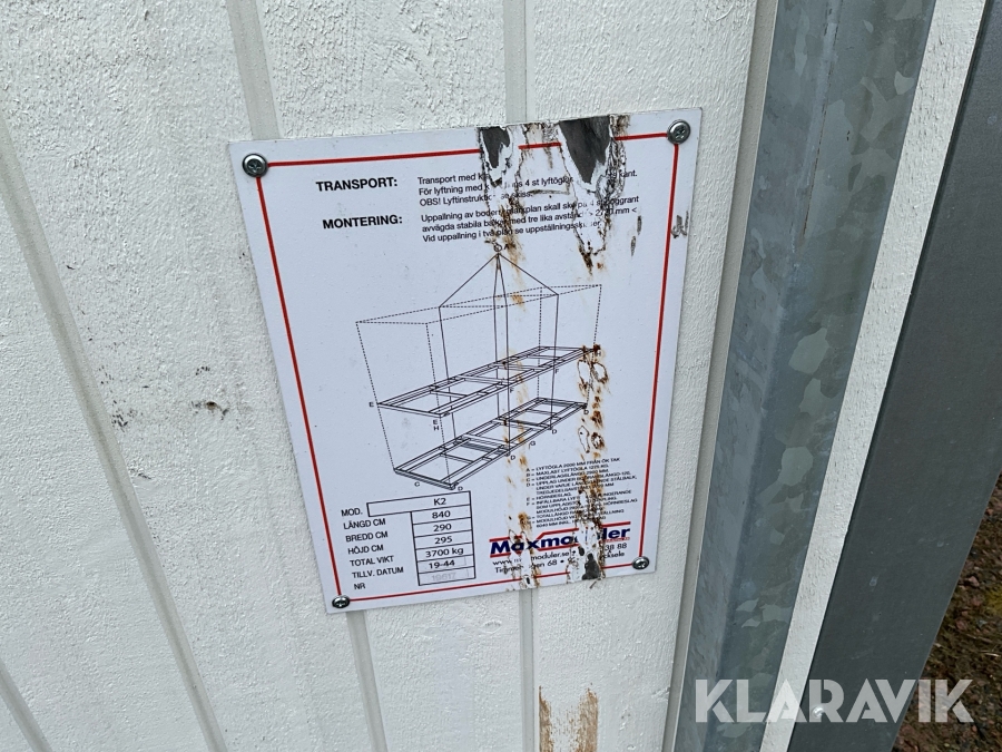 For sheds and containers (10 feet and larger), loading assistance can be purchased. Payment is made either by invoice or by card at the seller's location. The cost per lift is SEK 500 + VAT.