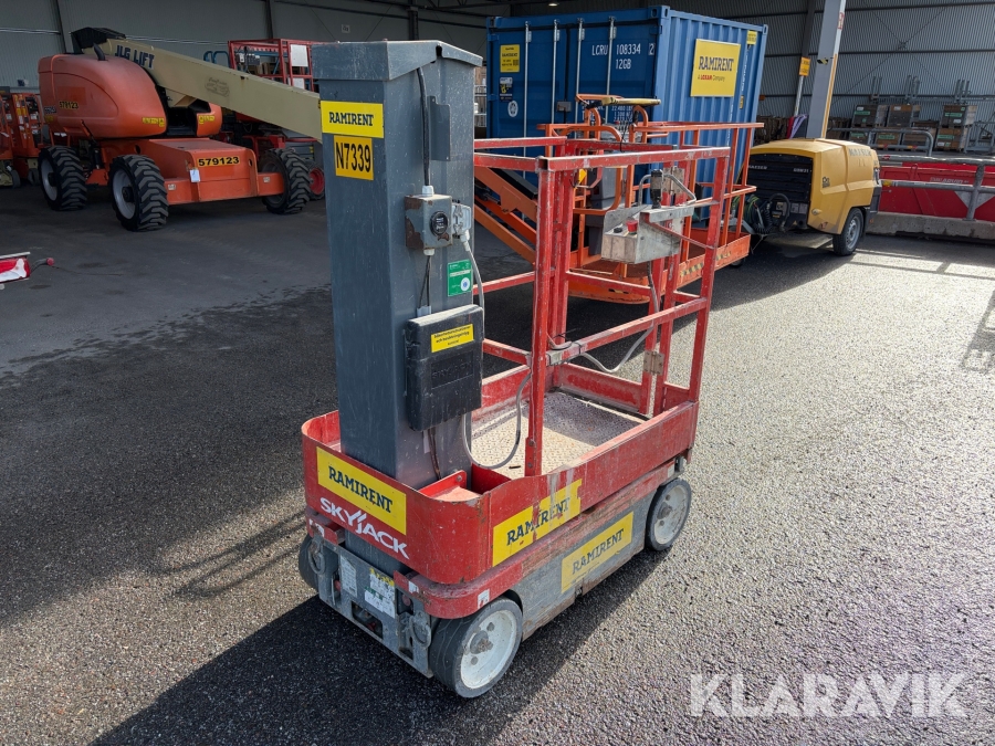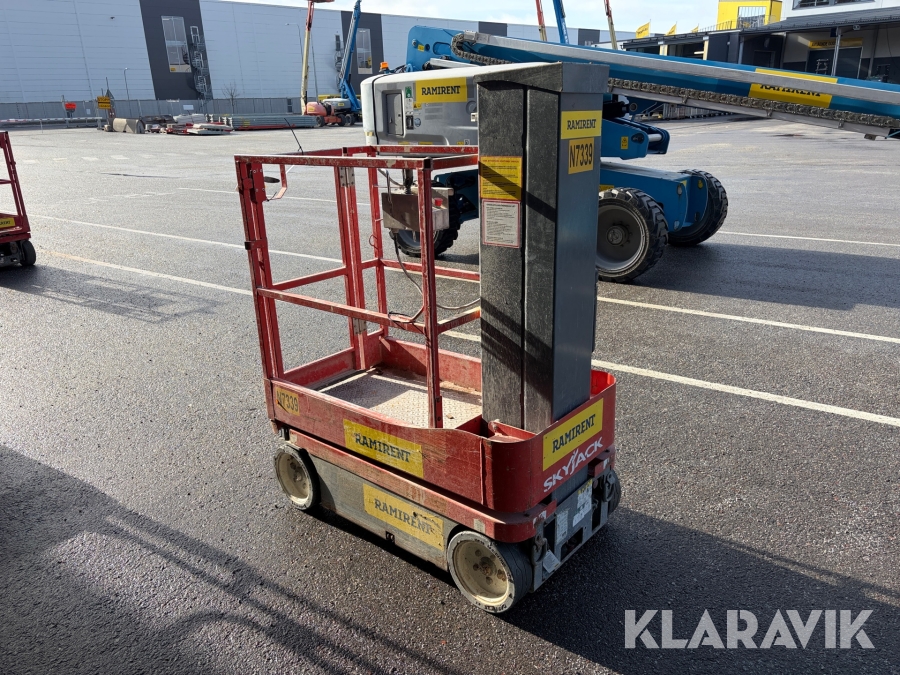 Skyjack SJ16 är en kompakt och eldriven vertikal pelarlift som är idealisk för arbete på höjd i trånga inomhusmiljöer. Med en arbetshöjd på upp till 6,75 meter och en plattformskapacitet på 227 kg erbjuder den en stabil och säker arbetsplattform för en eller två personer med verktyg. Dess smala bredd på endast 0,76 meter och låga vikt på cirka 966 kg gör den lätt att manövrera genom standarddörrar och i hissar, vilket underlättar arbete i begränsade utrymmen.
