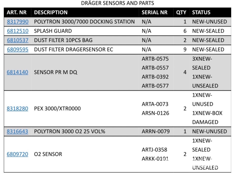 Parti med sensorer och delar Dräger