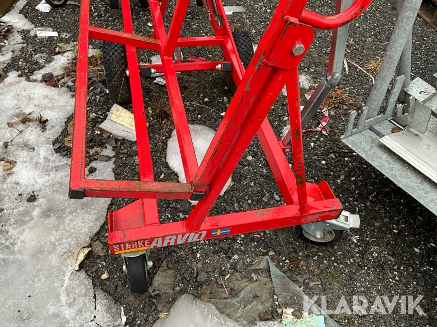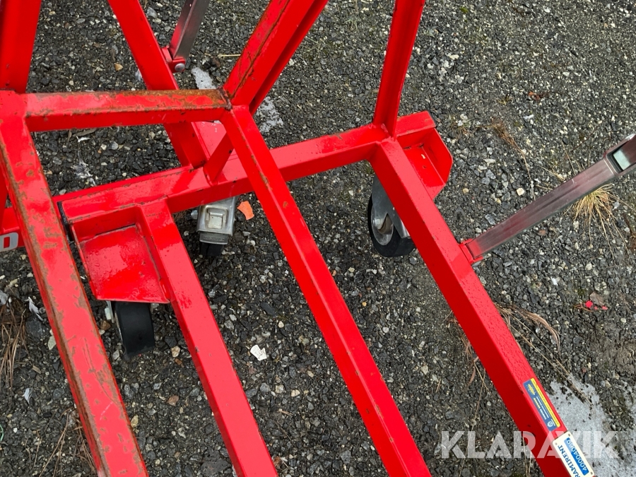 Kombinerad transportvagn och arbetsbord. För transport av spån- och gipsskivor, glas, plåt, snickerier m m. Hjulkonstruktionen möjliggör stabil transport på ojämnt underlag, passerar lätt trösklar, kablar och diverse andra hinder. Förvandlas lätt till ett stadigt arbetsbord i arbetsriktig höjd. Två 4-lagers luftgummihjul 4.00-4 med kullager, fyra länkhjul Ø 160 mm (två bromsade, två obromsade) med kullager.
