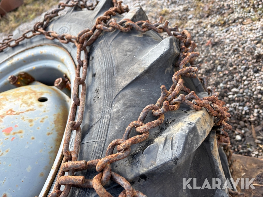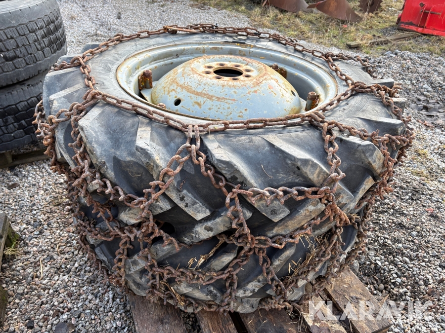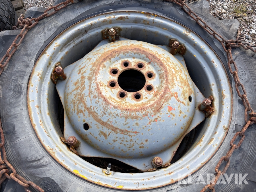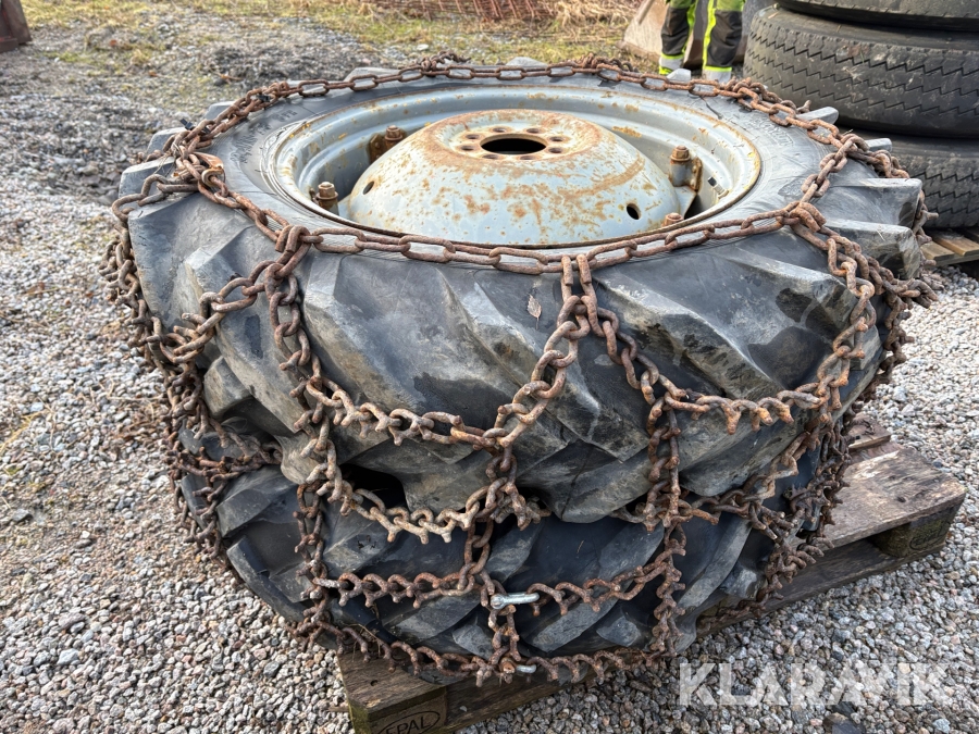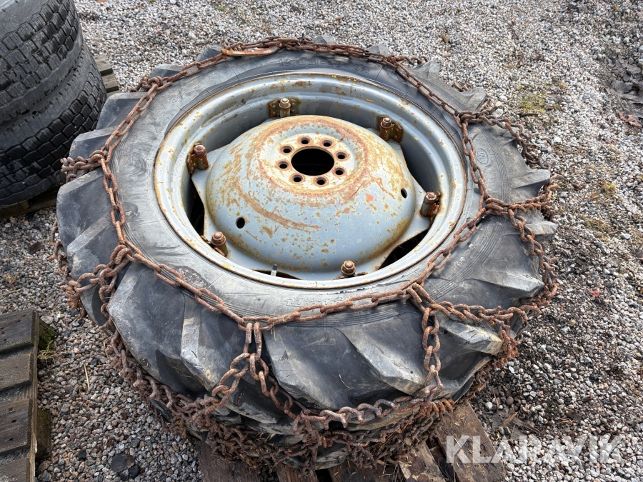 Traktordäck med fälg & kedjor, 2st 12.4/11-28 2 st
