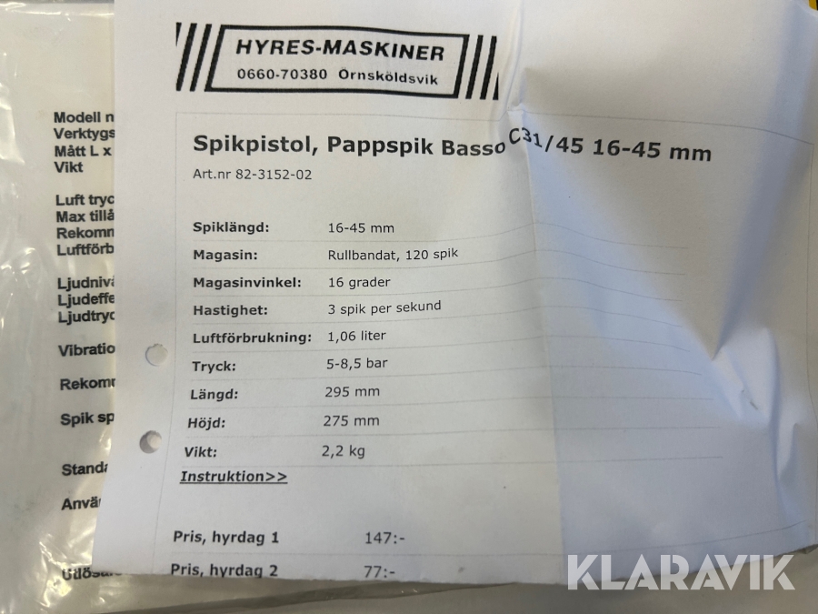 Boka frakt? Det finns ingen specifik information om frakt för just det här objektet, men om du skickar oss en förfrågan via vårt fraktformulär, så undersöker vi möjligheten. Paket, EU-pall eller större maskin? Klaravik har fraktavtal med Schenker och i de fall vi kan hjälpa till med frakt gäller det objekt som ryms i paket eller inom en EU-pall (upp till 120*80 cm och 990 kg). Det går att beställa frakt inom Sverige, dock inte till utlandet. Vid frakt på större maskiner rekommenderar vi gärna transportföretag som du kan kontakta.