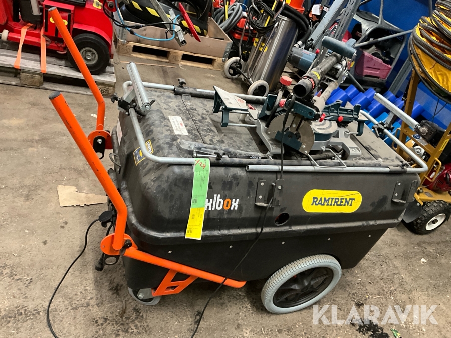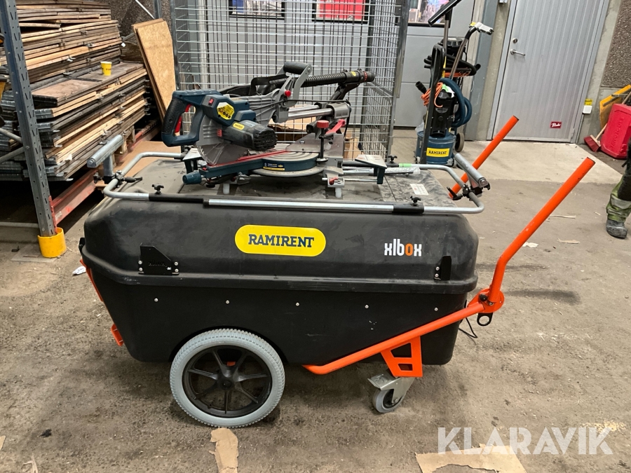 Verktygsvagn med monterad kap & gersåg från Bosch. I vagnen kan man ha allehanda verktyg samt möjlighet att koppla in ström för att ladda batterier. Du kan även koppla in ström till grenuttag för att försörja andra maskiner. Utdragbara armar för att få bra arbetsyta. Kap & gersågen har laser för tydlig syn av det som skall kapas.