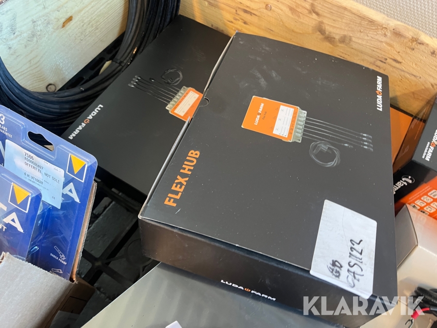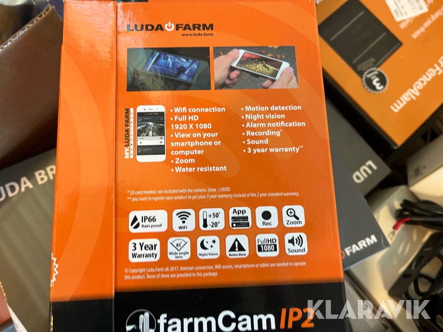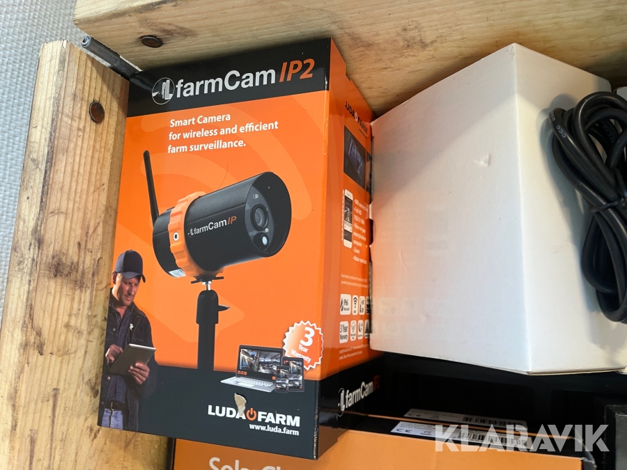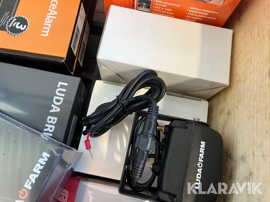 Diverse övervakningskameror, belysning, kablar Luda Bridge 300, Kramp, Varta, Farm Cam IP2