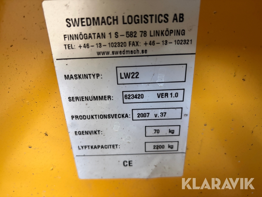 Boka frakt? Det finns ingen specifik information om frakt för just det här objektet, men om du skickar oss en förfrågan via vårt fraktformulär, så undersöker vi möjligheten. Paket, EU-pall eller större maskin? Klaravik har fraktavtal med Schenker och i de fall vi kan hjälpa till med frakt gäller det objekt som ryms i paket eller inom en EU-pall (upp till 120*80 cm och 990 kg). Det går att beställa frakt inom Sverige, dock inte till utlandet. Vid frakt på större maskiner rekommenderar vi gärna transportföretag som du kan kontakta.