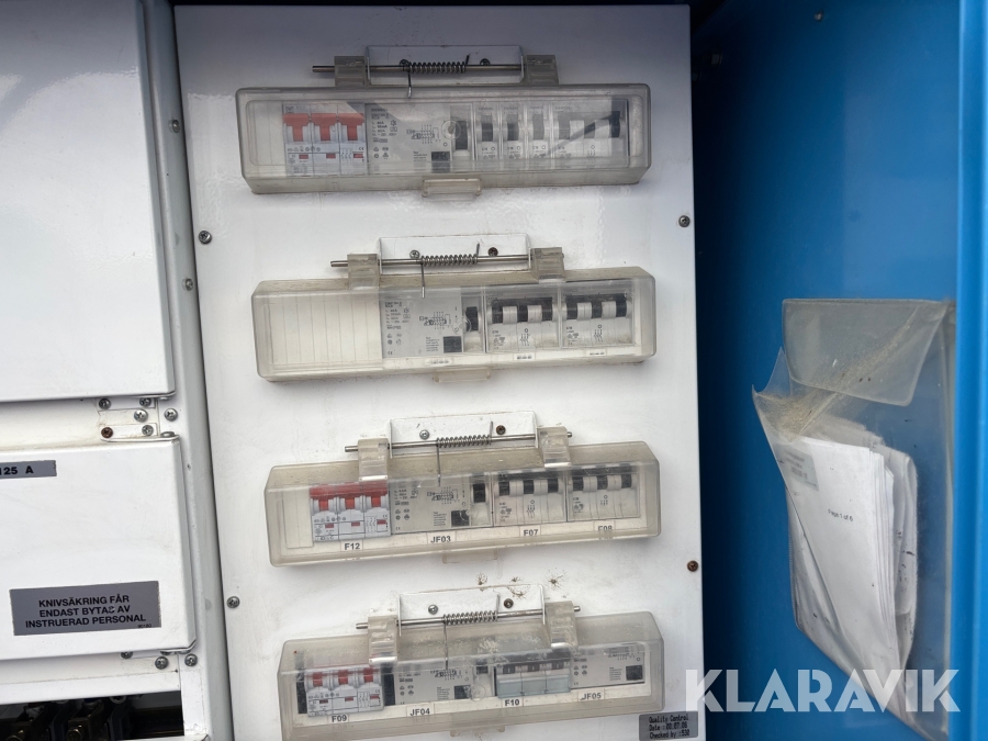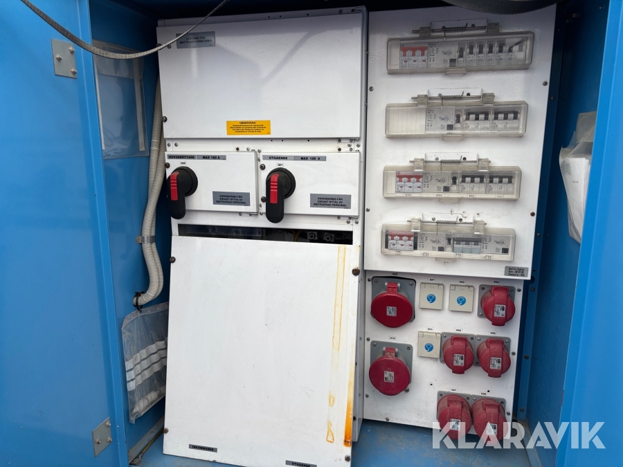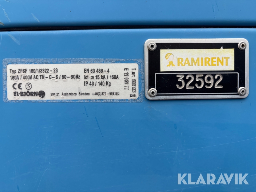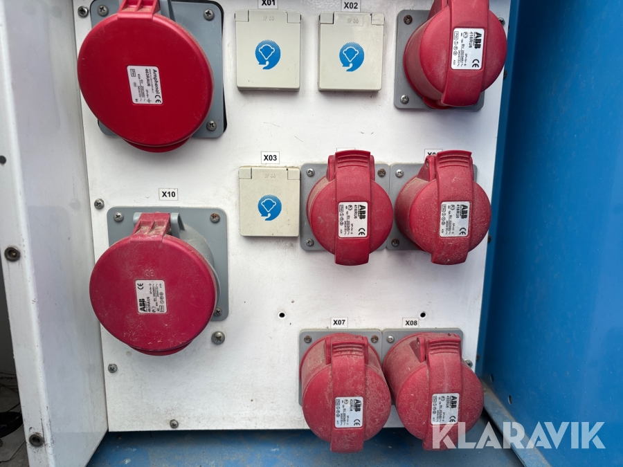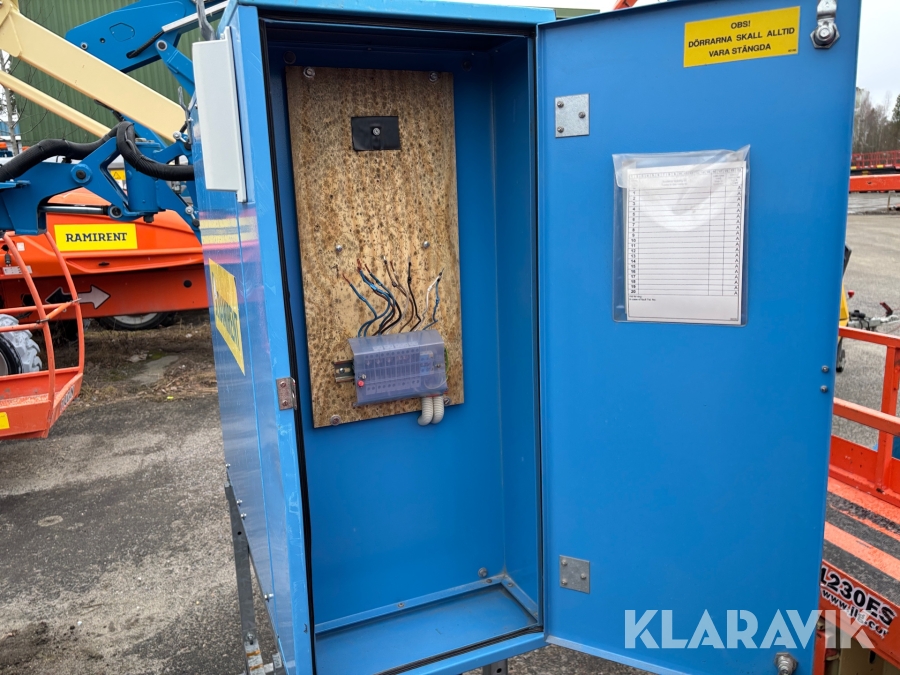 Robust skåp anpassad för inomhus och utomhusmiljö. Dörren är låsbar, benstativ anpassat efter pall och har gaffelgångar. Anslutning av inkommande kabel sker fast på kopplingsplint 4- eller 5-ledarsystem. Uttagen föregås av jordfelsbrytare och avsäkras med dvärgbrytare av C-karakteristik.