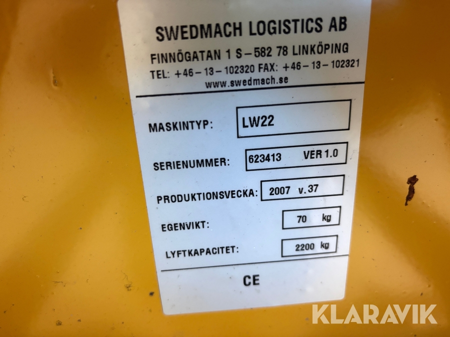Boka frakt? Det finns ingen specifik information om frakt för just det här objektet, men om du skickar oss en förfrågan via vårt fraktformulär, så undersöker vi möjligheten. Paket, EU-pall eller större maskin? Klaravik har fraktavtal med Schenker och i de fall vi kan hjälpa till med frakt gäller det objekt som ryms i paket eller inom en EU-pall (upp till 120*80 cm och 990 kg). Det går att beställa frakt inom Sverige, dock inte till utlandet. Vid frakt på större maskiner rekommenderar vi gärna transportföretag som du kan kontakta.