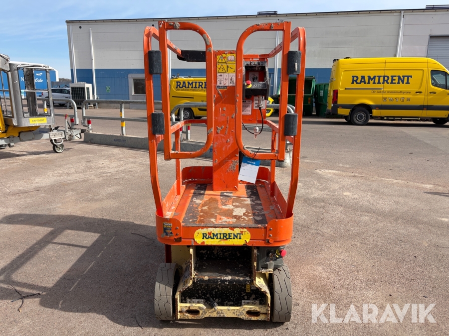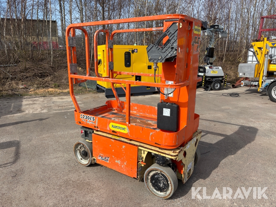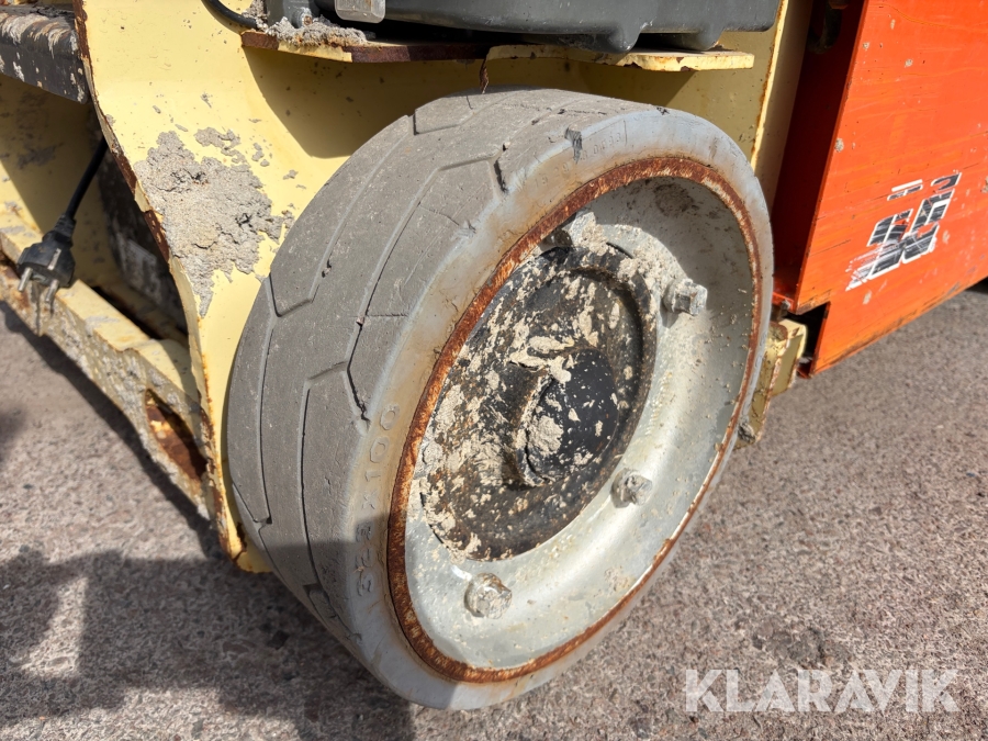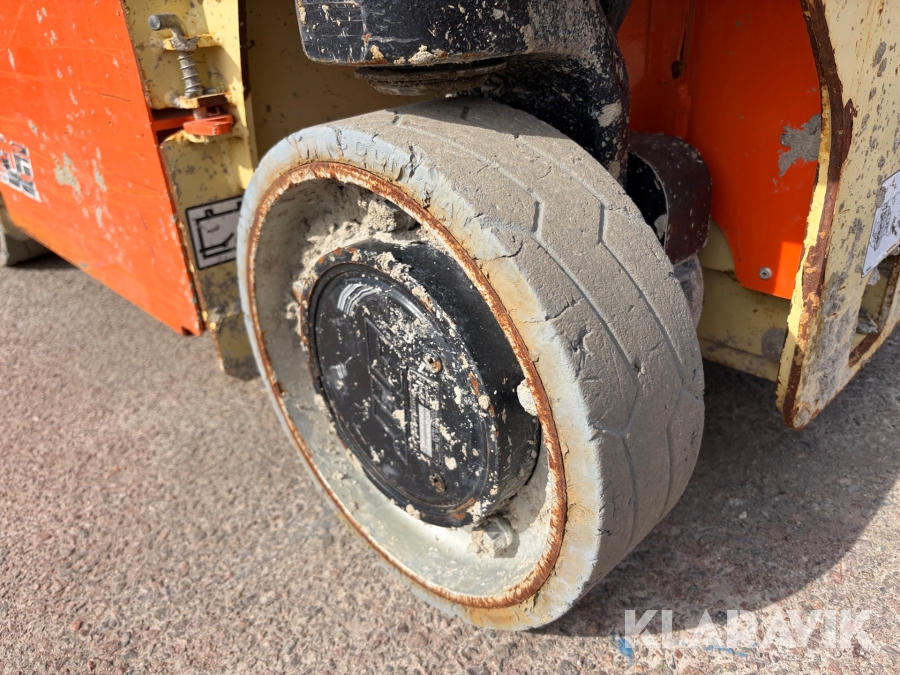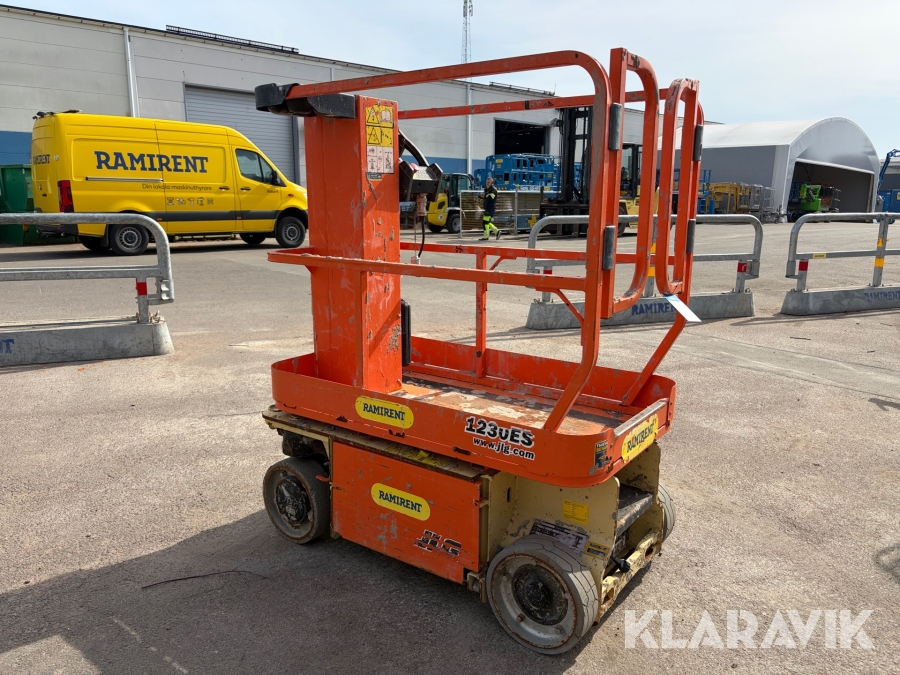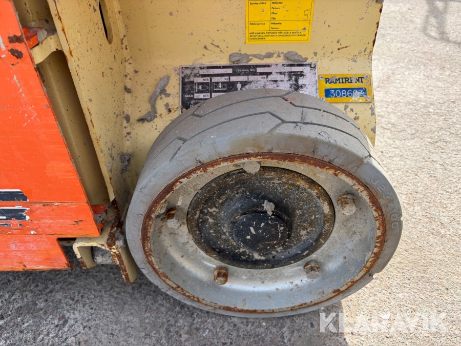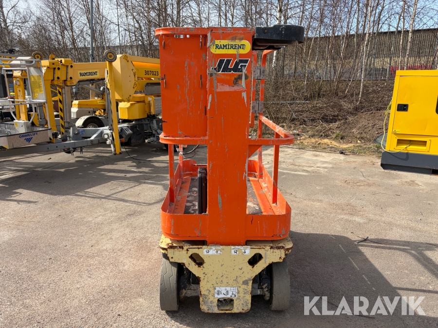JLG 1230ES är en kompakt och eldriven pelarlift som är idealisk för arbete på höjd i trånga inomhusmiljöer. Med en arbetshöjd på upp till 5,66 meter och en plattformskapacitet på 230 kg erbjuder den en stabil och säker arbetsplattform för en person med verktyg. Dess smala bredd på endast 0,76 meter och låga vikt på cirka 790 kg gör den lätt att manövrera genom standarddörrar och i hissar, vilket underlättar arbete i begränsade utrymmen. Med en svängradie på endast 13 cm och en körhastighet på upp till 4,8 km/h i nedfällt läge är den mycket lättmanövrerad. Säkerhetsfunktioner som lutningssensor, potthålsskydd och varningslarm är standard, vilket gör JLG 1230ES till ett pålitligt val för underhålls- och installationsarbeten inomhus.