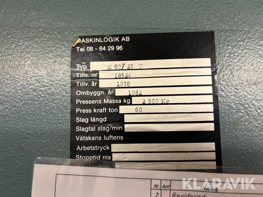 Boka frakt? Det finns ingen specifik information om frakt för just det här objektet, men om du skickar oss en förfrågan via vårt fraktformulär, så undersöker vi möjligheten. Paket, EU-pall eller större maskin? Klaravik har fraktavtal med Schenker och i de fall vi kan hjälpa till med frakt gäller det objekt som ryms i paket eller inom en EU-pall (upp till 120*80 cm och 990 kg). Det går att beställa frakt inom Sverige, dock inte till utlandet. Vid frakt på större maskiner rekommenderar vi gärna transportföretag som du kan kontakta.