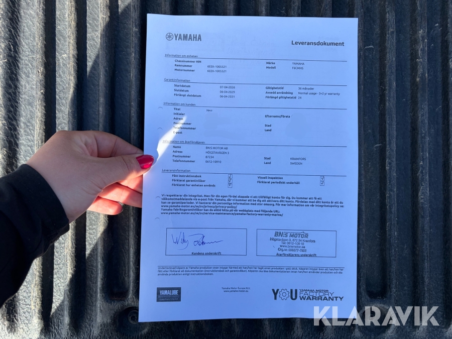 • Serie/chassinummer framgår