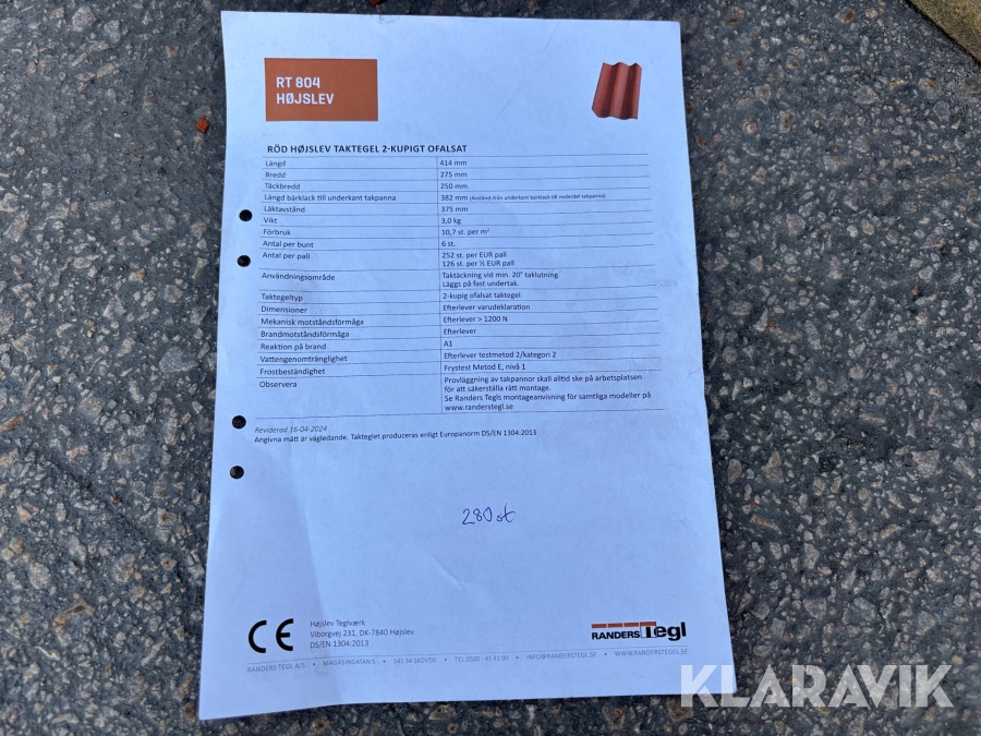 Taktegel Höjslev 2 kupig ofalsad 280 st