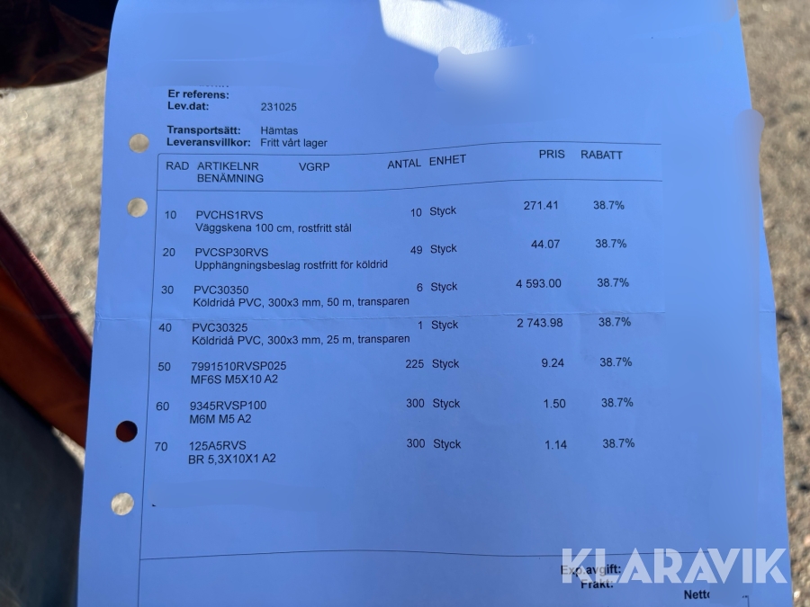 Boka frakt? Det finns ingen specifik information om frakt för just det här objektet, men om du skickar oss en förfrågan via vårt fraktformulär, så undersöker vi möjligheten. Paket, EU-pall eller större maskin? Klaravik har fraktavtal med Schenker och i de fall vi kan hjälpa till med frakt gäller det objekt som ryms i paket eller inom en EU-pall (upp till 120*80 cm och 990 kg). Det går att beställa frakt inom Sverige, dock inte till utlandet. Vid frakt på större maskiner rekommenderar vi gärna transportföretag som du kan kontakta.