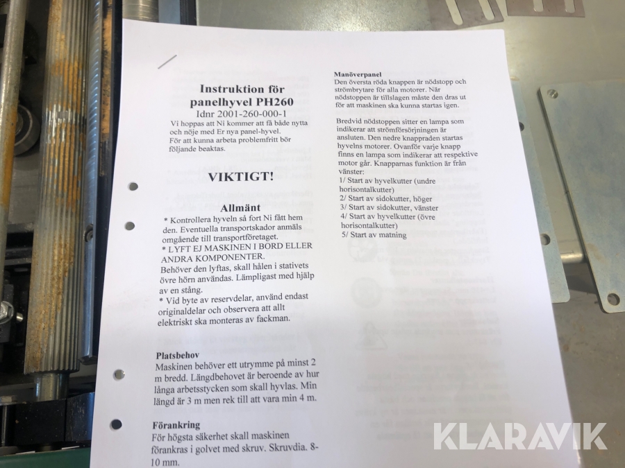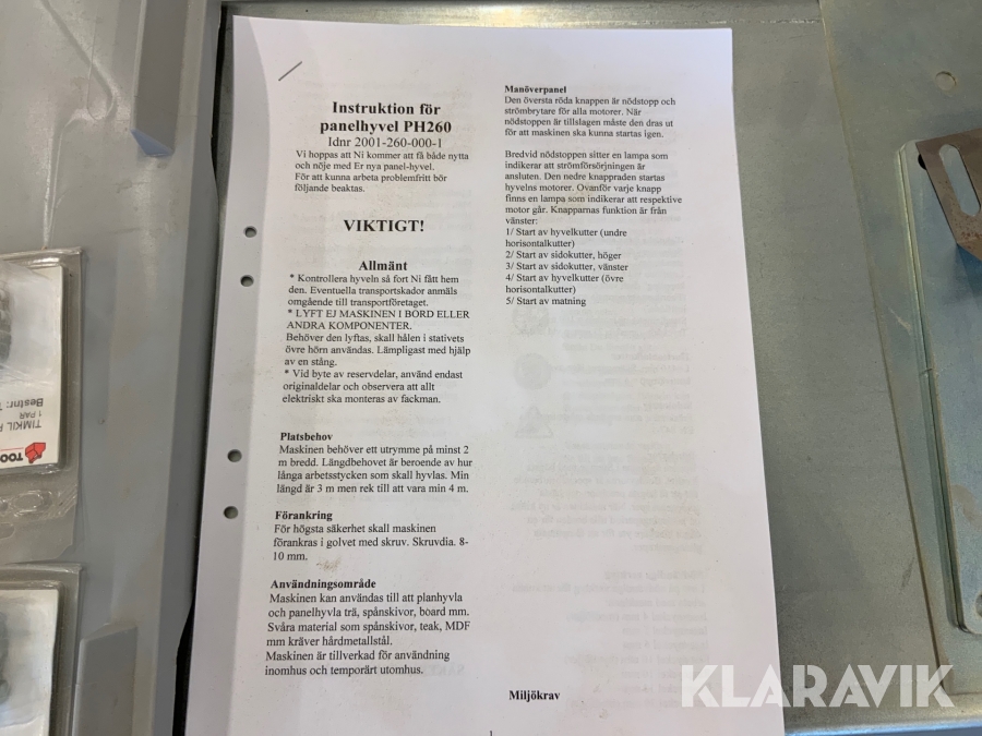 Boka frakt? Det finns ingen specifik information om frakt för just det här objektet, men om du skickar oss en förfrågan via vårt fraktformulär, så undersöker vi möjligheten. Paket, EU-pall eller större maskin? Klaravik har fraktavtal med Schenker och i de fall vi kan hjälpa till med frakt gäller det objekt som ryms i paket eller inom en EU-pall (upp till 120*80 cm och 990 kg). Det går att beställa frakt inom Sverige, dock inte till utlandet. Vid frakt på större maskiner rekommenderar vi gärna transportföretag som du kan kontakta.