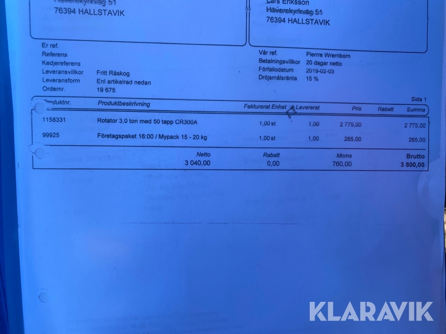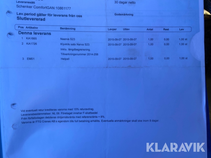 Boka frakt? Det finns ingen specifik information om frakt för just det här objektet, men om du skickar oss en förfrågan via vårt fraktformulär, så undersöker vi möjligheten. Paket, EU-pall eller större maskin? Klaravik har fraktavtal med Schenker och i de fall vi kan hjälpa till med frakt gäller det objekt som ryms i paket eller inom en EU-pall (upp till 120*80 cm och 990 kg). Det går att beställa frakt inom Sverige, dock inte till utlandet. Vid frakt på större maskiner rekommenderar vi gärna transportföretag som du kan kontakta.