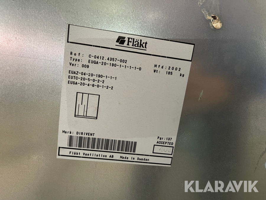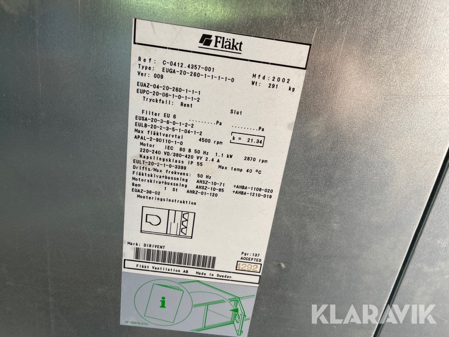 Ventilationsaggregat Fläkt ventilation AB EUGA-20-190