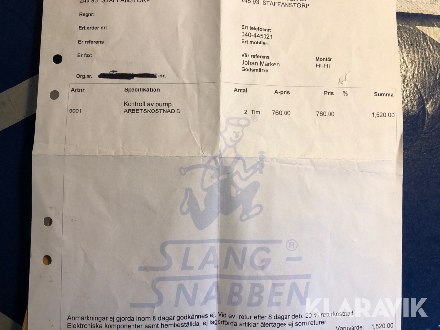 Boka frakt? Det finns ingen specifik information om frakt för just det här objektet, men om du skickar oss en förfrågan via vårt fraktformulär, så undersöker vi möjligheten. Paket, EU-pall eller större maskin? Klaravik har fraktavtal med Schenker och i de fall vi kan hjälpa till med frakt gäller det objekt som ryms i paket eller inom en EU-pall (upp till 120*80 cm och 990 kg). Det går att beställa frakt inom Sverige, dock inte till utlandet. Vid frakt på större maskiner rekommenderar vi gärna transportföretag som du kan kontakta.