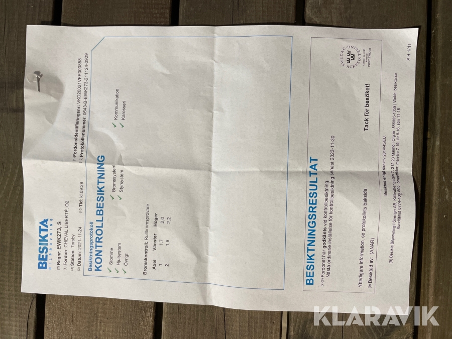 Du som köpare är skyldig att kontrollera objektet vid hämtning. Skiljer sig något avsevärt jämfört med informationen på klaravik.se? Kontakta då Klaravik innan du tar objektet från platsen. Läs fullständiga köpvillkor.